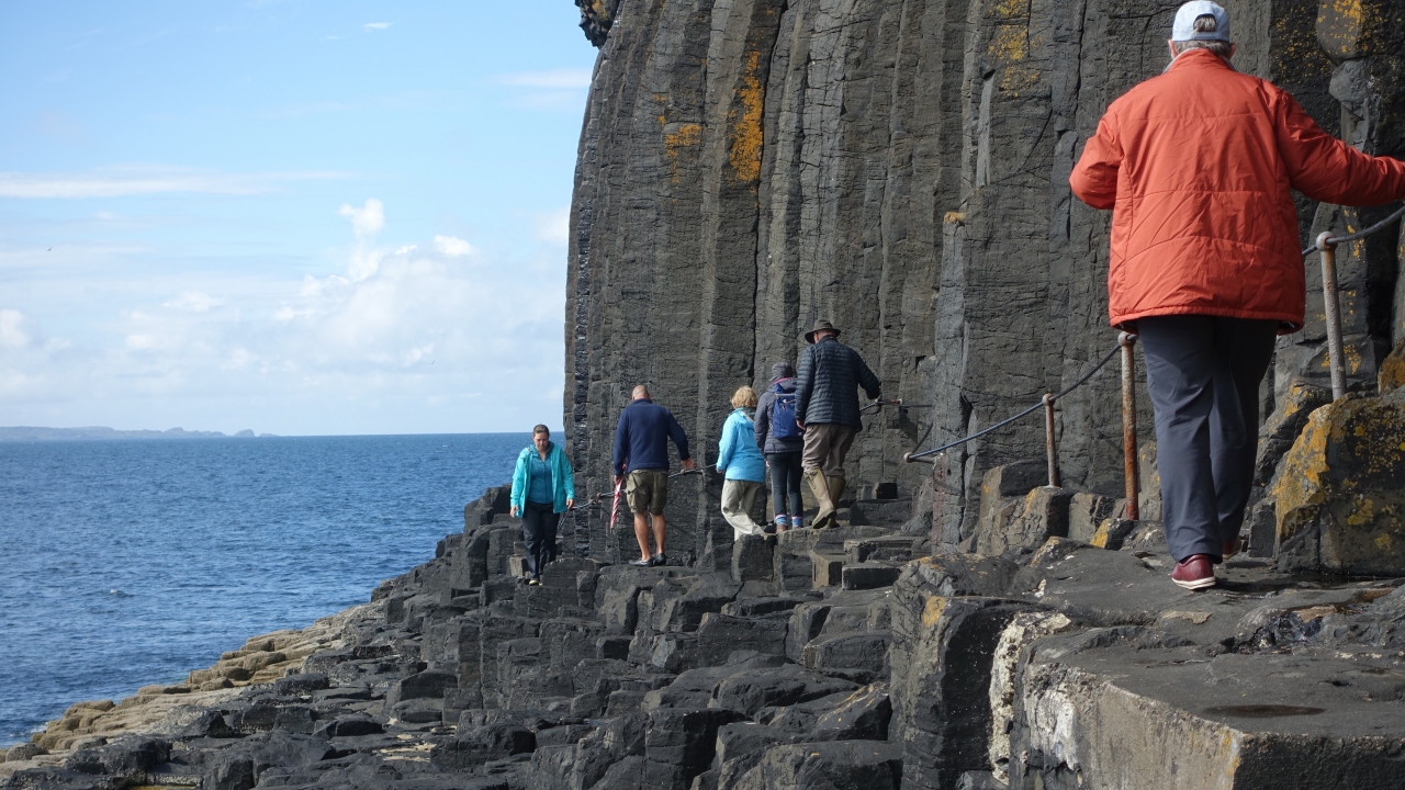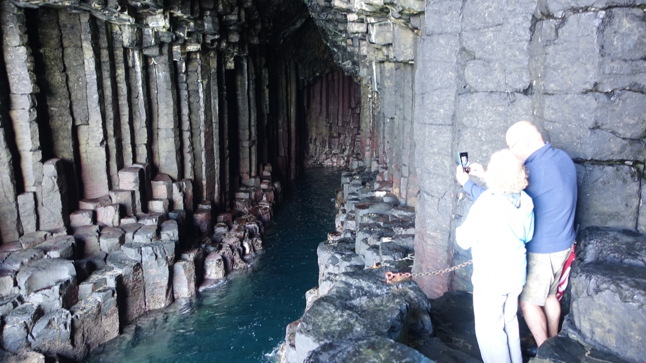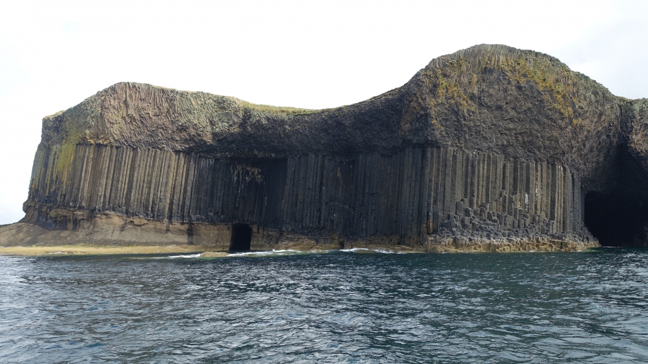 フィンガルの洞窟のあるスタッファ島は島全体が六角柱の玄武岩の柱状節理で出来ており、世界遺産に指定されたアイルランドの「ジャイアントコーズウェイ」に勝るとも劣らない景観である。