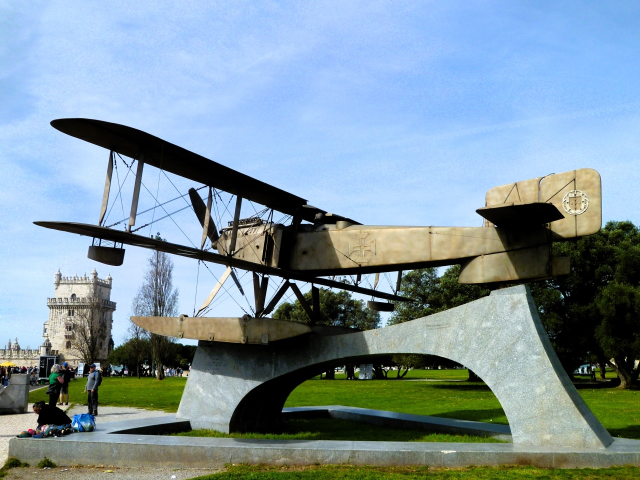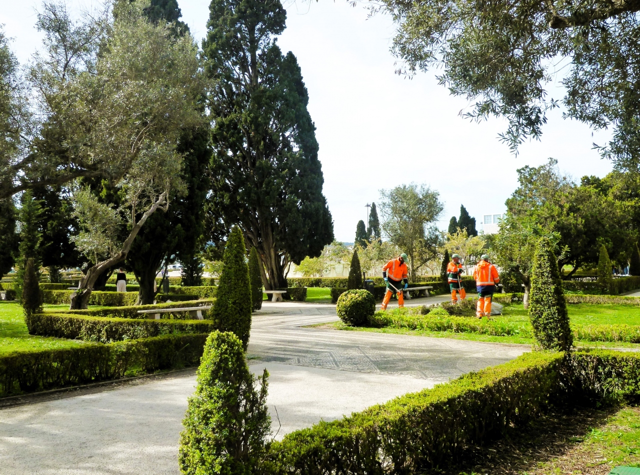 `ベレンの塔`のテージョ川沿いからブラジリア通りまで<トーレ デ ベレン庭園>で、水上飛行機 サンタ クルス号`も;広々とした樹木/柵の植木/芝生/噴水も/路は舗装//庭園≒公園ですね♪ たまたま、3人の庭園作業者に会いましたが、安全反射タスキも装着してあり日本と変わらないですね☆