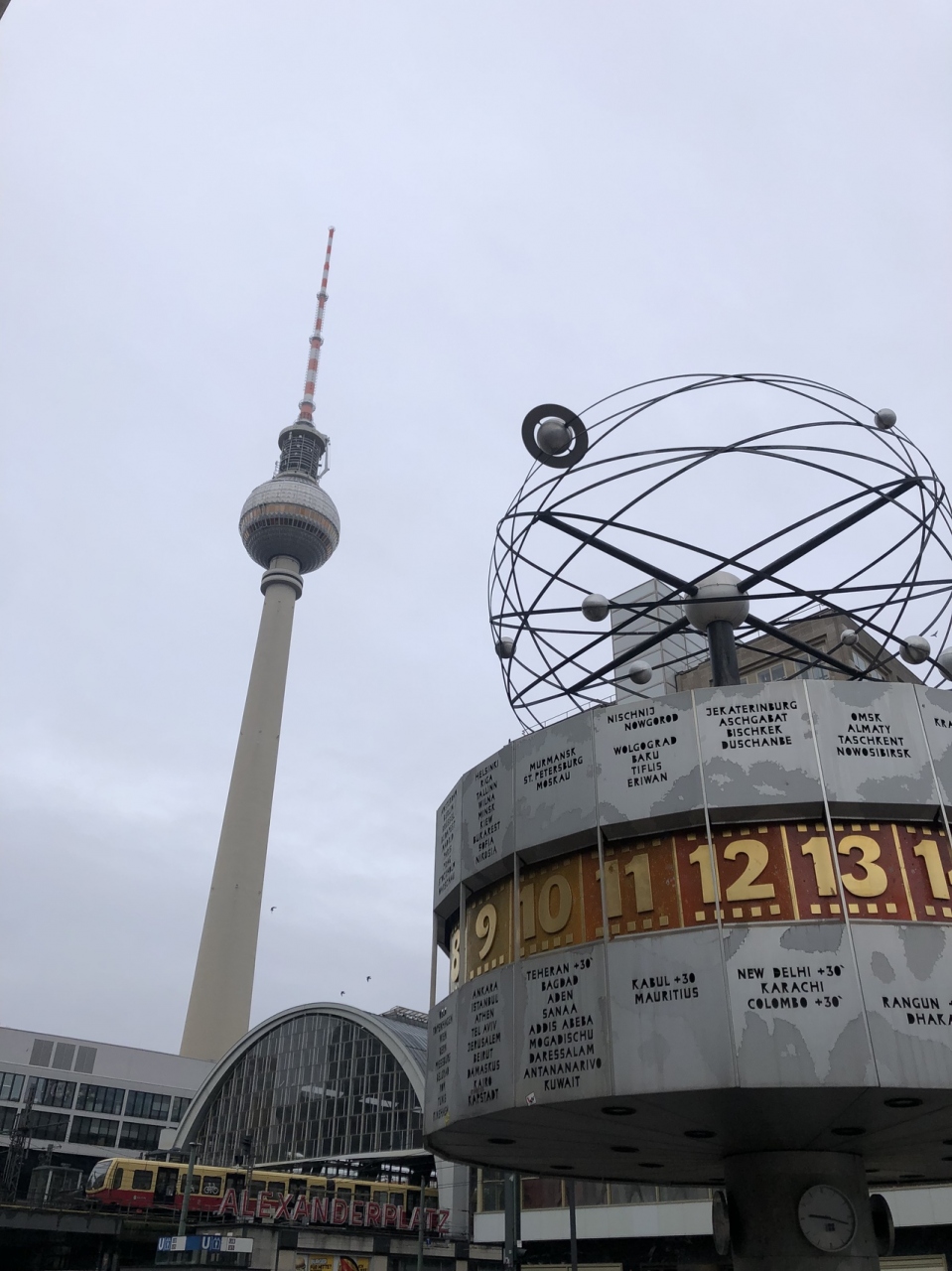 テレビ塔と並ぶベルリンの有名なシンボル時計です。金属製の円形建築のマーキングを読み取ることにより世界中の148の主要都市の現在時刻を特定できるそうで、もちろんTokyoもありました。今の時代なら絶対このデザインは浮かばなそうなSFぽい形がかわいくて逆に新鮮です。