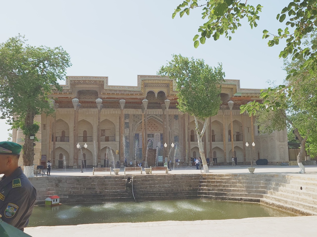 ブハラのアルク城のすぐ近くにあります。正面に何本も立つ木造の細い柱と天井装飾が美しかったです。建物の正面に池があるのですが、水はほんのちょっとしか溜まってませんでした。日曜日に訪れたのですが、閉まっていて中は見学できませんでした。