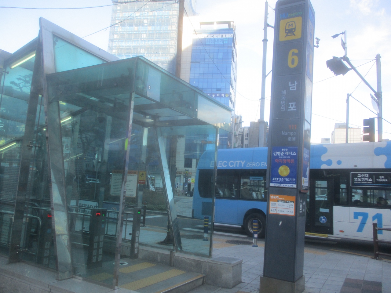 南浦駅は地下にある駅で駅ホームから改札口、改札口から地上までのエスカレーターが設置されていました。特に、釜山市内全般に言えることはエスカレーターの速度が遅いです。日本の0,7倍ぐらいの速度でした。普段、生活しているように使っているバンコクの地下鉄の半分くらいの速度でした。