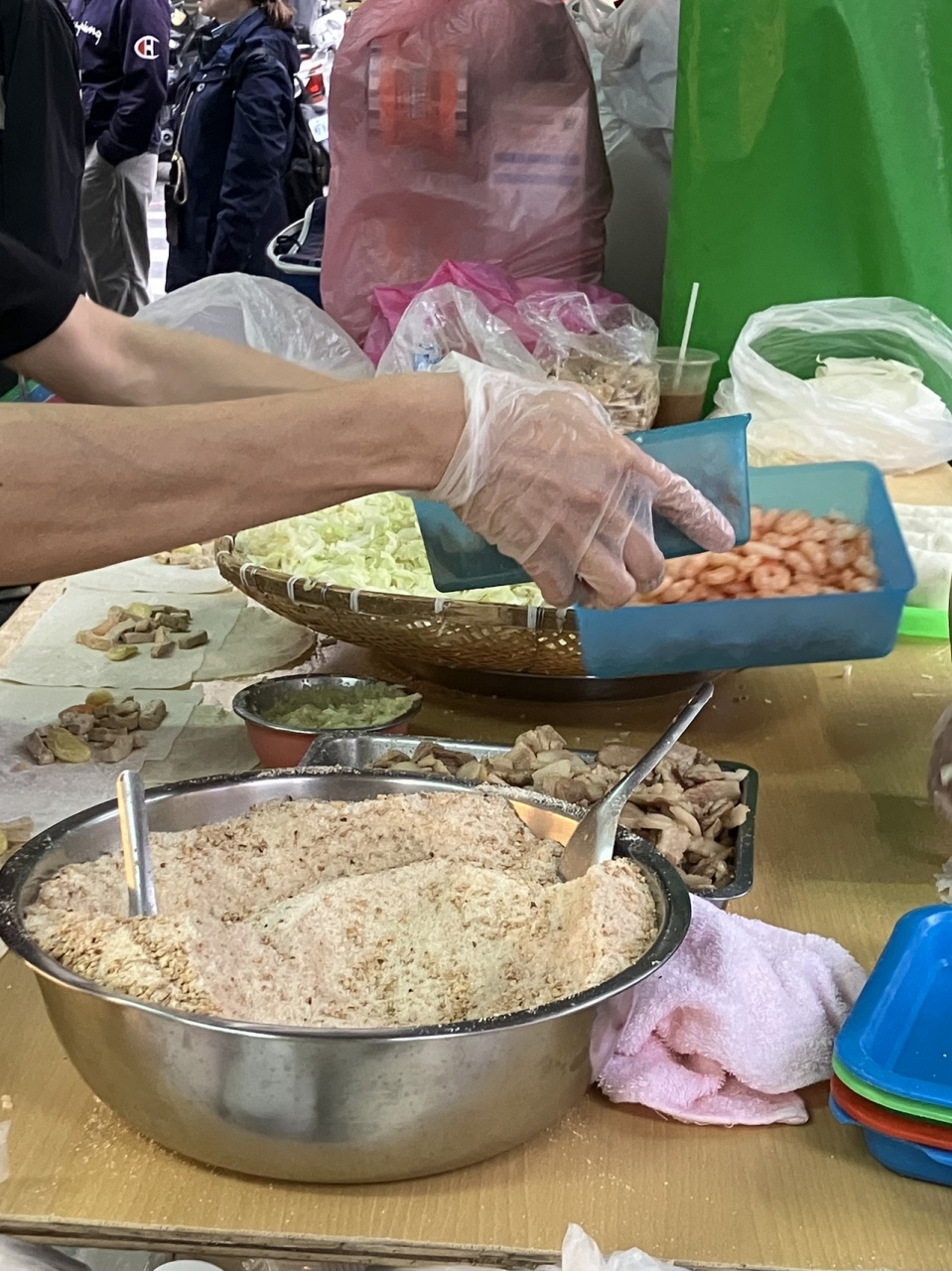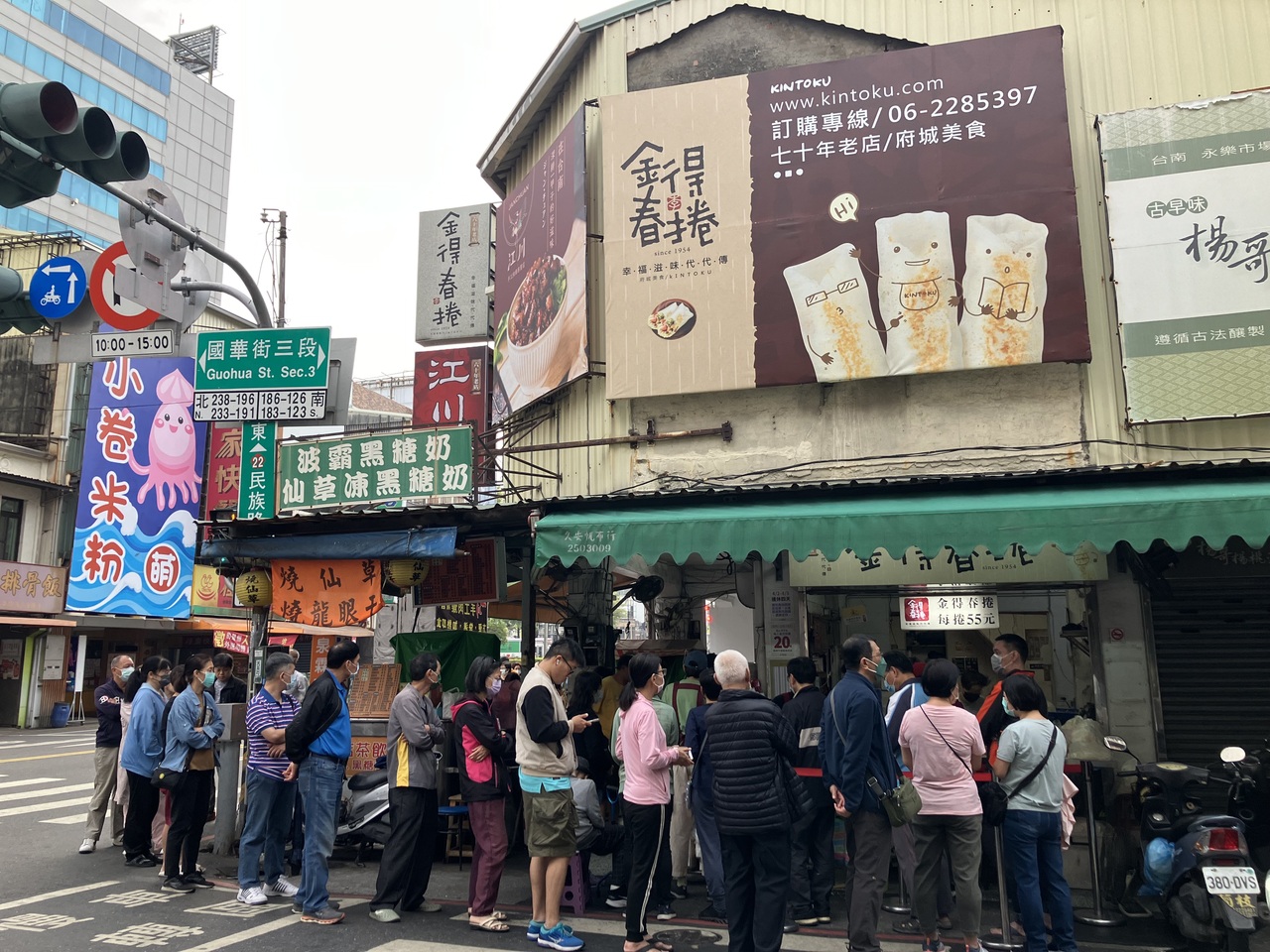 台鐵「台南駅」から徒歩で20分ほどです。民族路三段の「国華街」入口にあります。台南ではこちらの生春巻きが有名。早朝7:30から長い行列です。店頭で職人が手早く春巻きを包んでいます。キャベツ、豚肉、小エビなどなど10種類ほどの具材を載せて最後にどっさりとピーナッツ粉糖を振りかけて巻き上げます。菓子パン感覚!台南の名物春巻きです!55元。