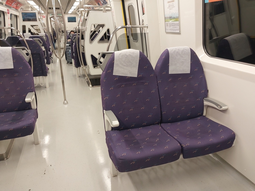 空港から台北市内に行く高速鉄道。足元が非常に広く、機内持ち込みサイズのスーツケースなら足元に置けます。klookなどで事前に購入すると少し安いので絶対にMRTで市内に行く人は買った方がいいです。終電後はバスで台北市内に行くことになるので、終電の時間を調べてから買うと良いでしょう。