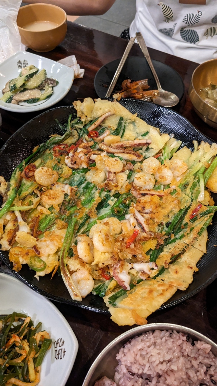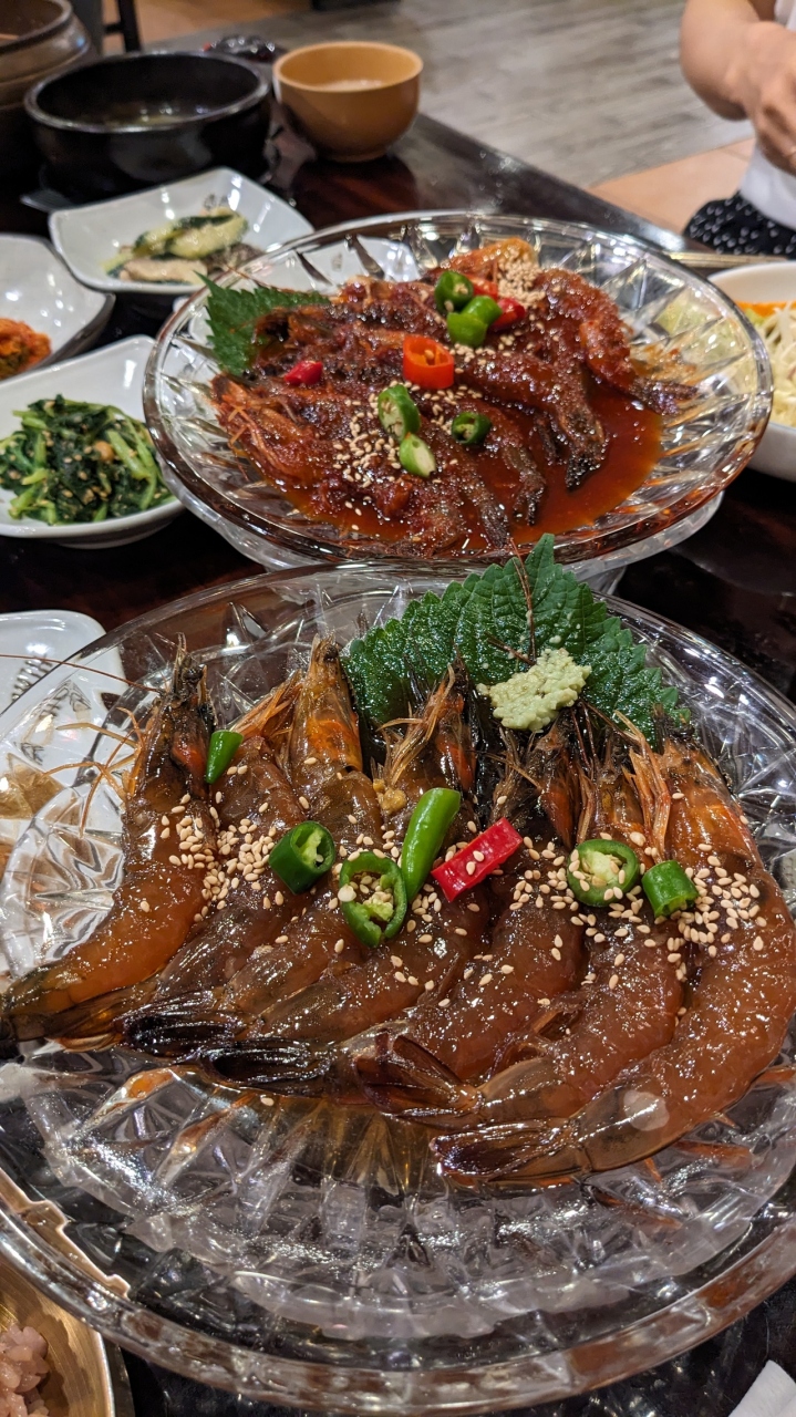 初のカンジャンセウを国際市場近くの人気店に行きました。ディナータイムでしたが結構空いてました。2階席もあり。カンジャンセウとチヂミを注文。カンジャンセウは濃い目の味付け。ご飯が進む。パンチャン、チヂミは美味しかった。ちょっと思ったのと違いました。