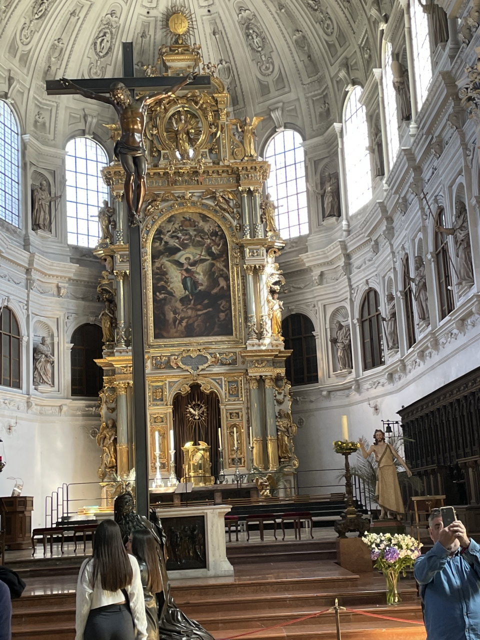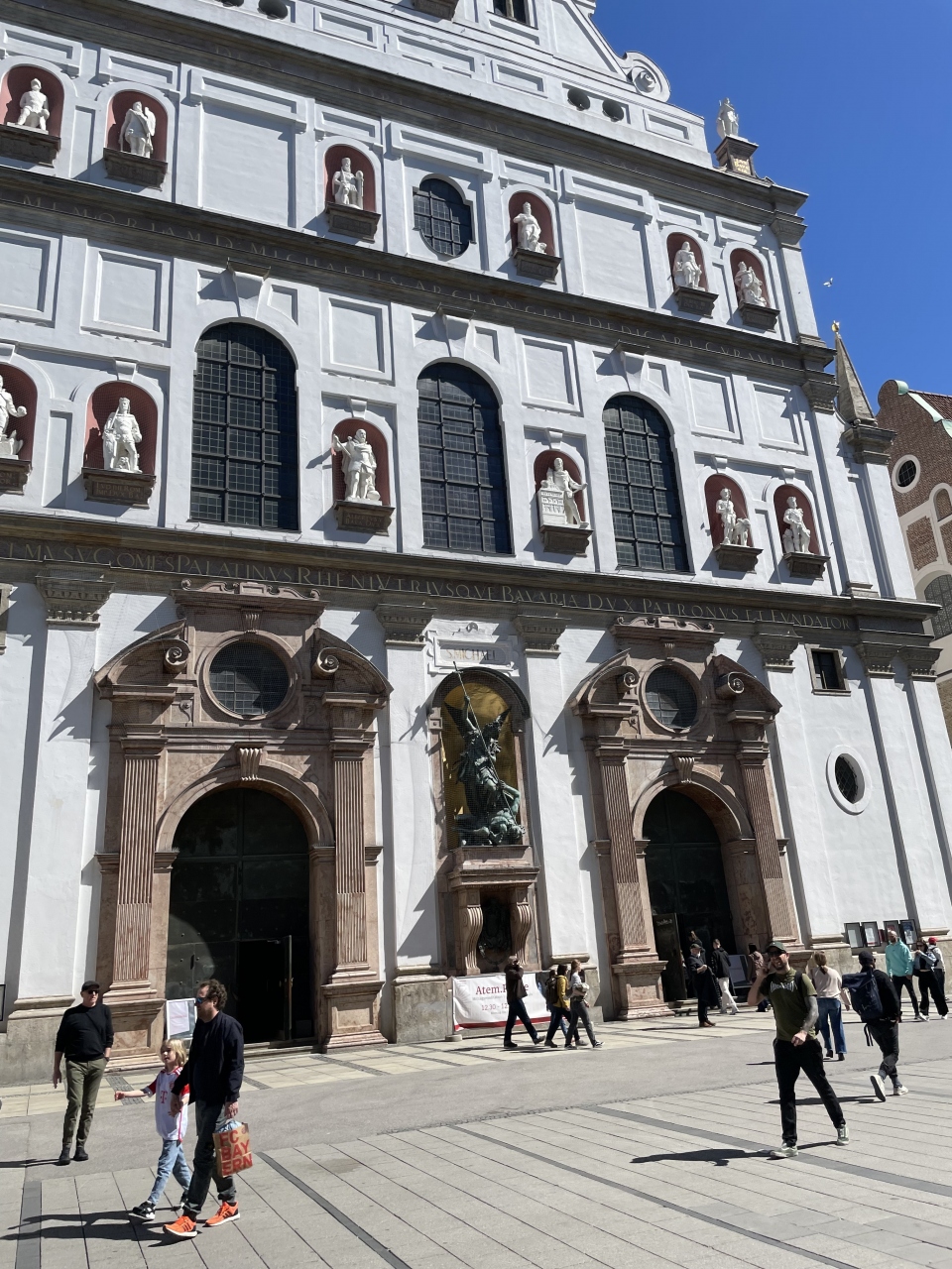 中央駅からカールス門をすぎてノイハウザー通り沿いにマリエン広場へ向かう途中の左手にあります。周囲はいろんなショップがありますが、それほど違和感はありません。境界内に入るのは無料で、礼拝もできます。地下にルートビィッヒ2世の棺がありますが、そこへ行くのは有料となっています。礼拝室の内部は広く、荘厳です。