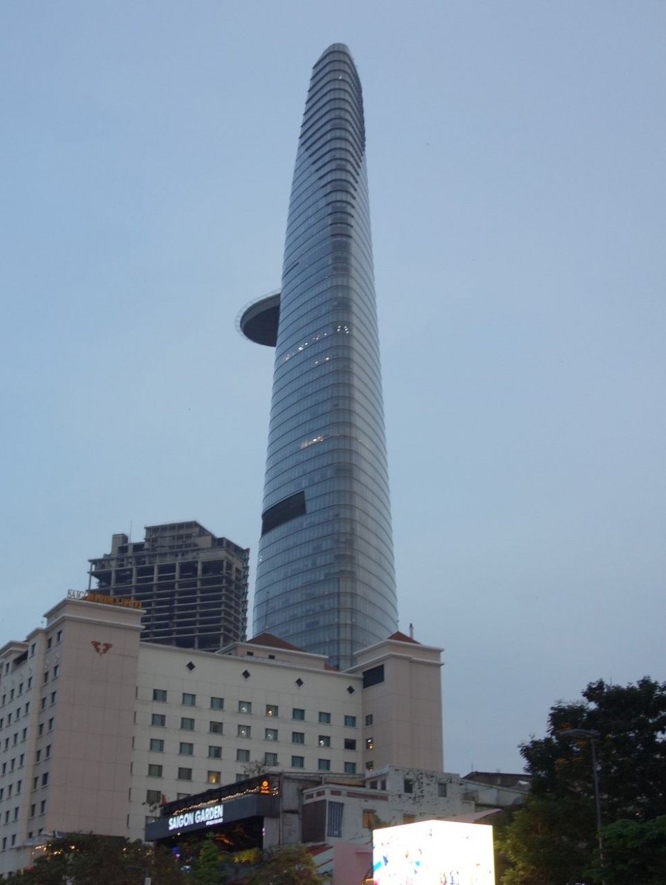 フエ通りだけではなくホーチミン市のランドマークとなっているビテクスコ フィナンシャルタワー (The Bitexco Financial Tower )。サイゴン川とタオディエン方面に舌の様なスカイデッキが張り出しています。かなり遠くからでないと全景を収める事ができません。サイゴン川から見るとほかのビルを従えているようで高さが際立ちます。