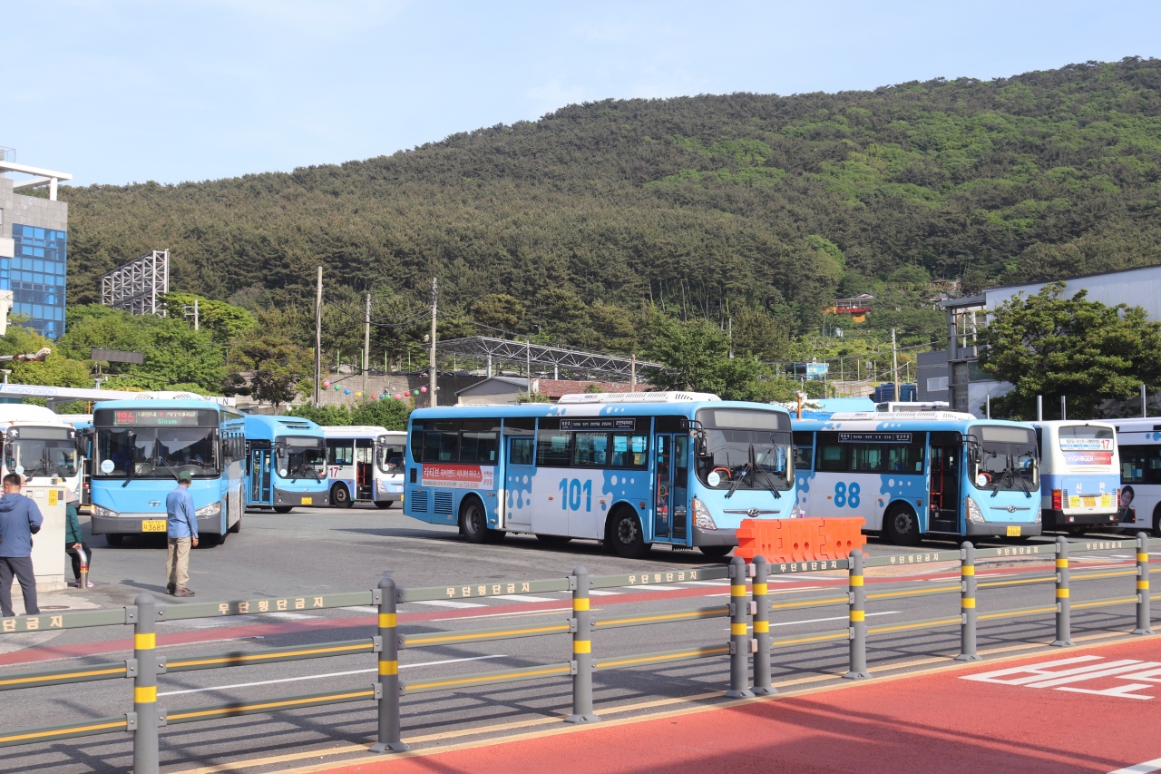 釜山から太宗台へ行く時に路線バスを利用しました。頭がでがいバスは天然ガスで走るようです。本数は多いですが、観光と地元民が重なり、混雑していました。終点の太宗台までアップダウンを繰り返し30分ほどでした。
