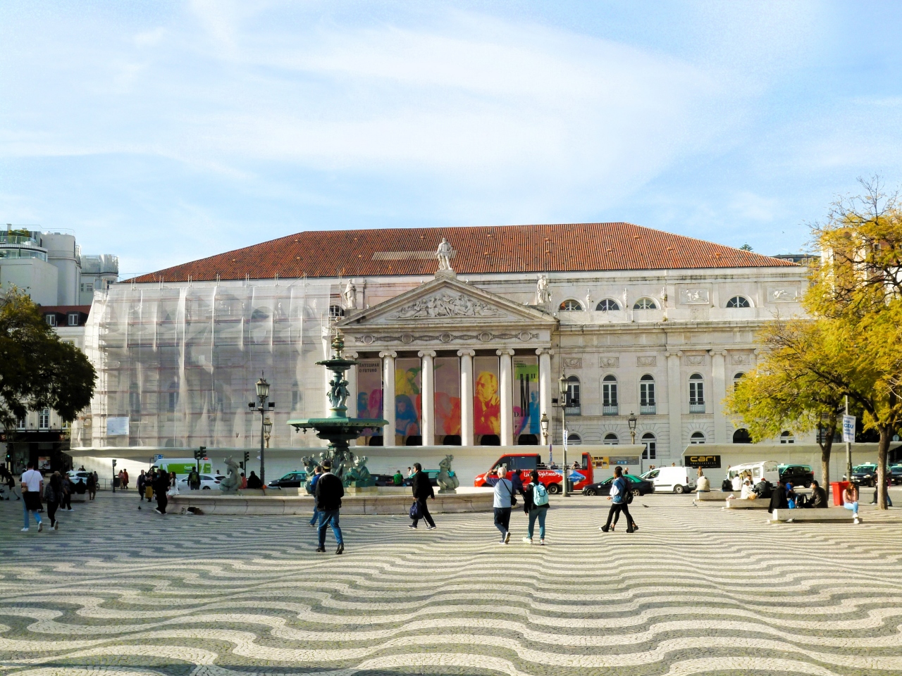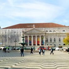 波模様の[ロシオ広場]で、北端に均整がとれ優雅な外観=ネオクラシック様式の<マリア2世国立劇場>があります;なんだか逆の発想で`マリア2世国立劇場の前にロシオ広場が`♪