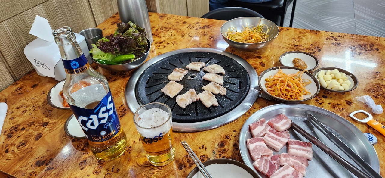 南大門市場、5番入口前に「炭火焼肉 心元」という焼肉屋があります。1人で入れる焼肉屋です。サムギョプサルは脂身が少ないので毎回この店を利用しています。とても美味しく、柔らかい肉なのでビールが美味しい飲めます。