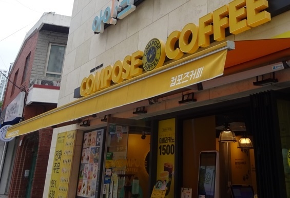 釜山のコンポーズコーヒー6号店 (西面NC店) です。メガコーヒーやEDIYAコーヒーと同じようなかんじで、チェーン店で釜山にも何店舗もあります。価格は安くてメガコーヒーくらいです。いろいろな種類のコーヒーがあって、利用客も多めでした。