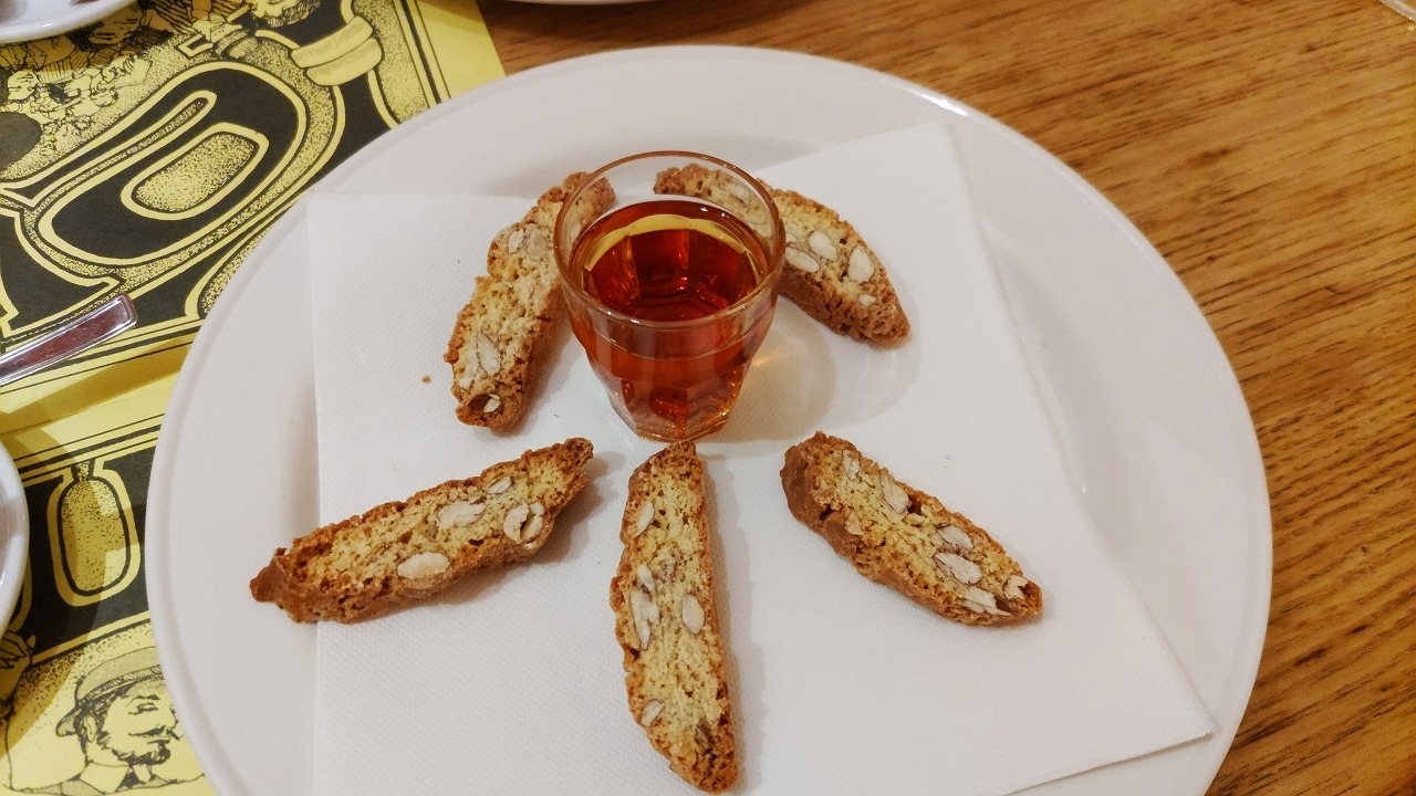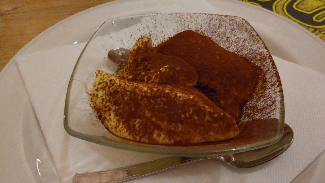 11年前にランチで利用し、パスタもピザも美味しかったので、今回はディナーを食べに行きました。夜の営業が始まった直後(19時前)に行ったら、すでに8割ほど席は埋まっていました。前回は日本語メニューを見せてもらったような気がしますが、今回は英語メニューのみ。オーダーも英語でOK。軽く食べて飲んで2人で60€位でした。