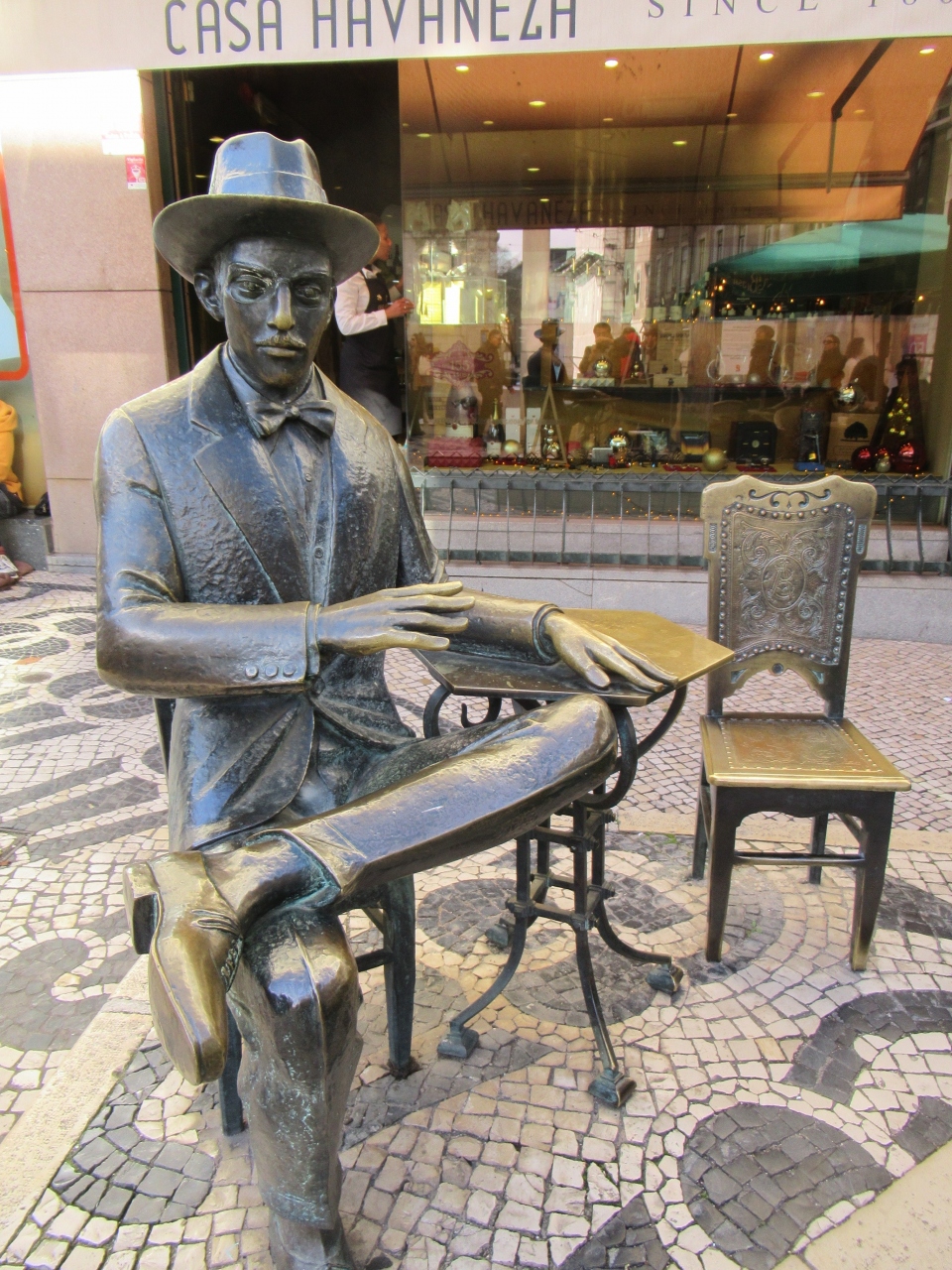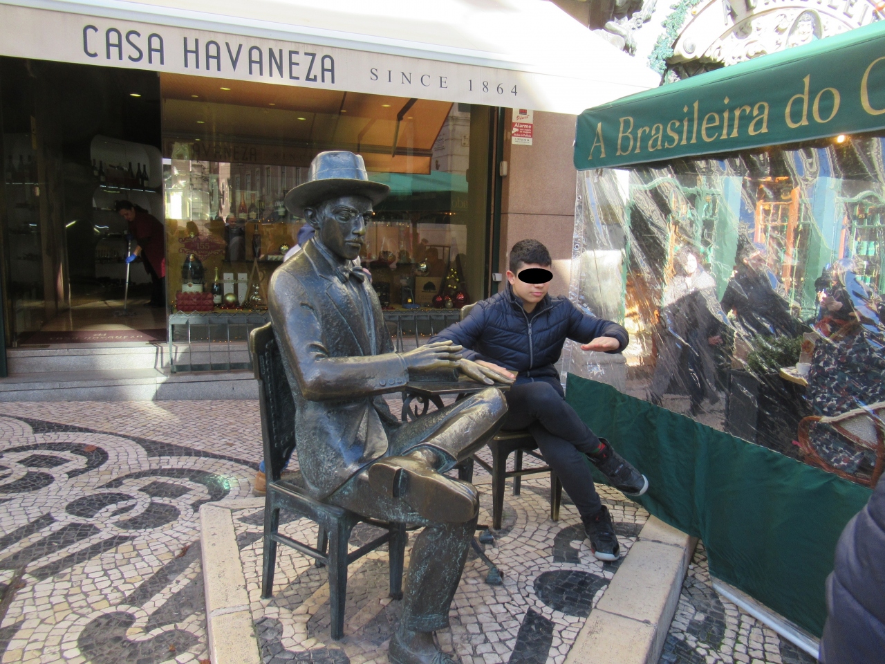 フェルナンド・ペソアは、ア ブラジレイラの常連客であったそうで、店前に帽子をかぶって蝶ネクタイをして座っている像が設けられました。