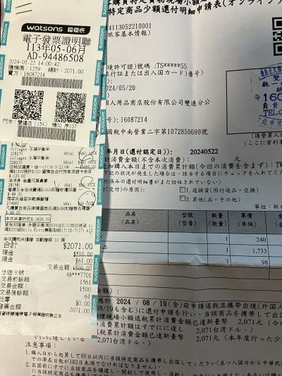 台湾観光局の抽選に当選して、台湾ドル$5000(約25,000円)の悠遊カードを頂いたので、(ワトソンの120元クーポン券もついていました。)コスメをワトソンで購入しました。悠遊カードは、1回の利用上限が台湾ドル1,500、1日の利用上限台湾ドル 3,000なので、2日に分けて購入します。免税のため2000台湾ドル以上の買物額にして、免税申告書を作成してもらいました。(要パスポート) 同一日、同じ店で2000台湾ドル以上購入すれば、免税返金対象となります。 嫁は写真にもある、買1送1(1個買えば、もう1個は無料)ばかり選んでいました!!...それって、最初の趣旨と買う物が変わってきているのでは(゚Д゚;)??.