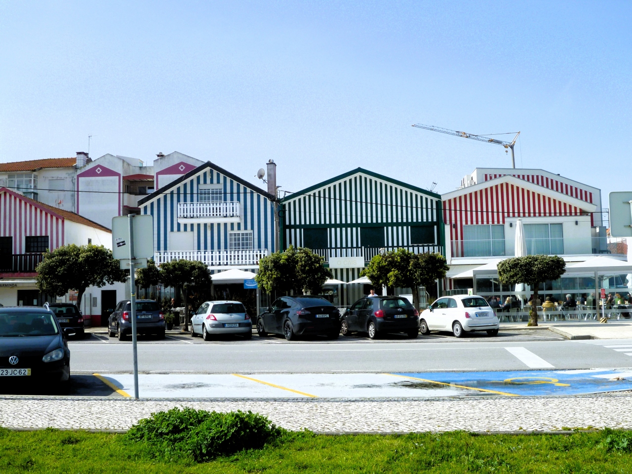 アヴェイロから観光バスで約30分で<コスタ ノヴァ>に着きました;街並みは`カラフルなストライプ模様`の家々が続きます…チョッとびっくりしましたが、100年以上前から漁師たちの我家の目印(霧が発生)で、当時は普通だったのですね! 現在、家々は 漁師たちの我家/バカンス地で別荘/レストラン//