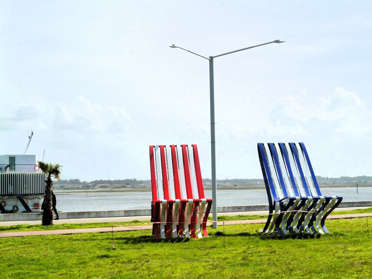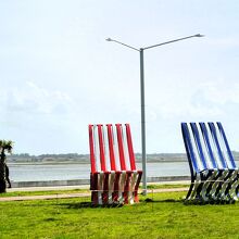 海沿い路には、大きなストライプ模様`赤と青`のリクライニングチェアが(左側の人)/海側ではなく歩道向けに(^-?)