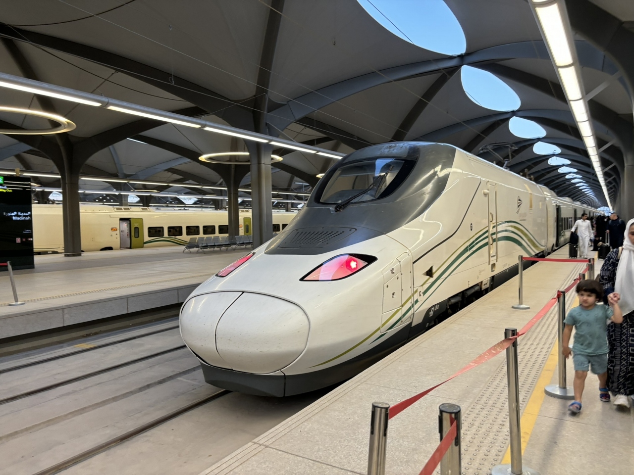 ジェッダから砂漠を一気に突っ切るハラマイン高速鉄道、終点のメディナ駅で下車しました。ジェッダのキング・アブドゥルアズィーズ国際空港と一体化した駅舎とはまた違って、メディナの駅は近未来的というかほぼSFの世界のようなデザインで一見の価値ありです。