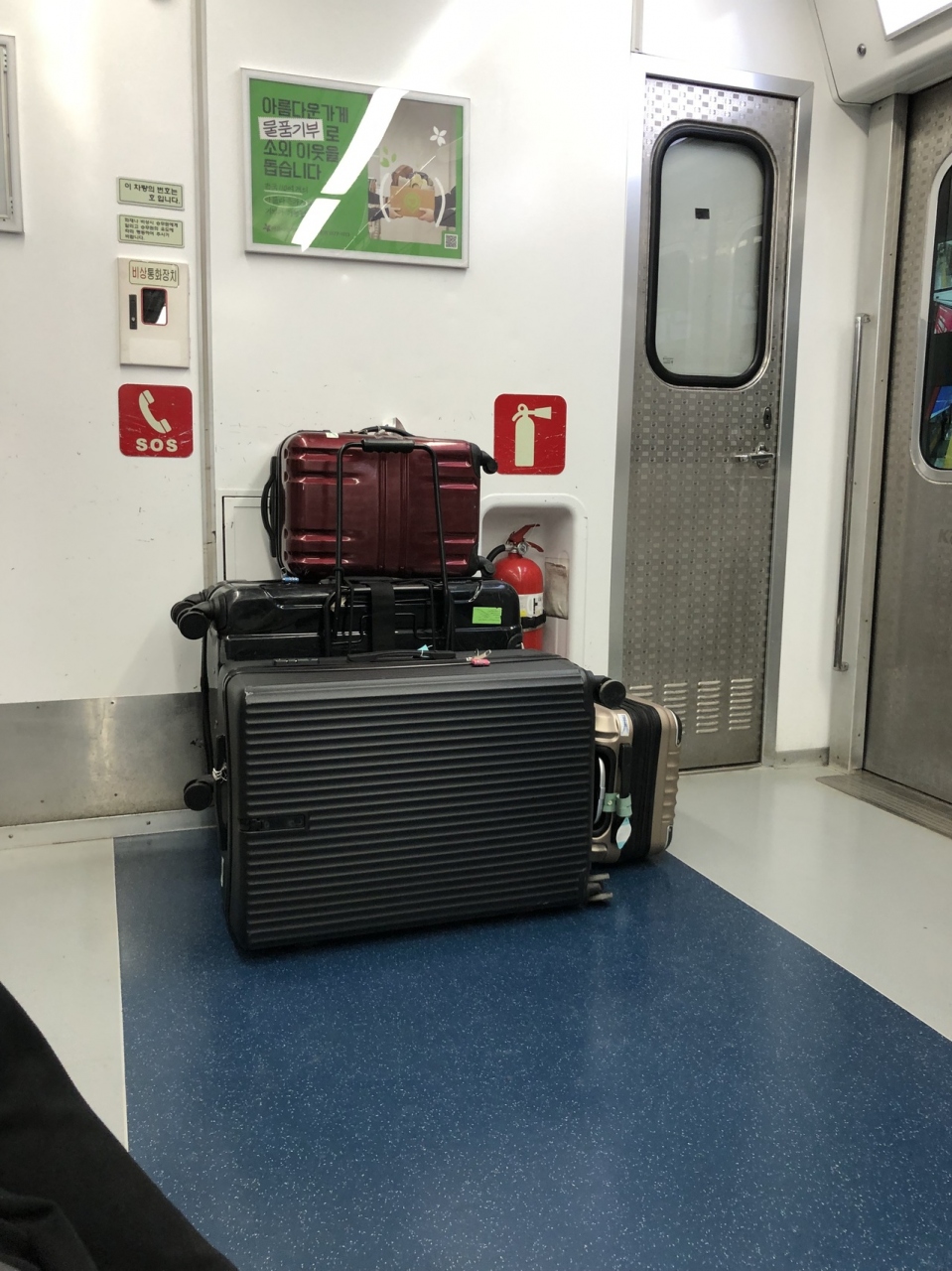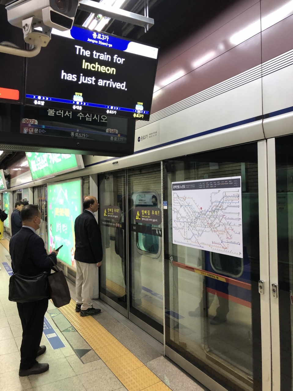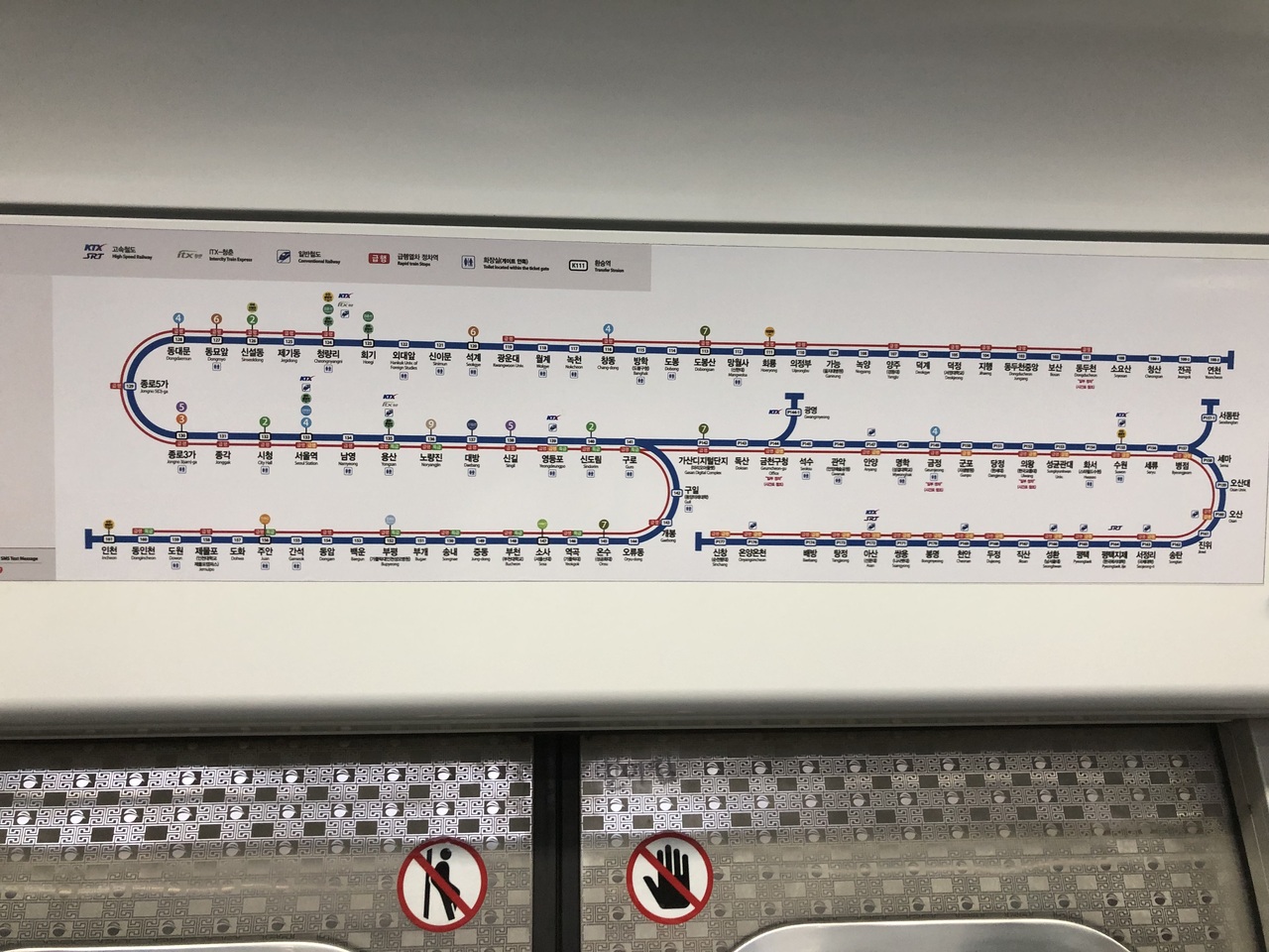 ソウルの宿泊先鍾路3街からソウル郊外の衛星都市水原への移動で地下鉄1号線を使いました。この路線は韓国国鉄KORAILの車両が乗り入れています。