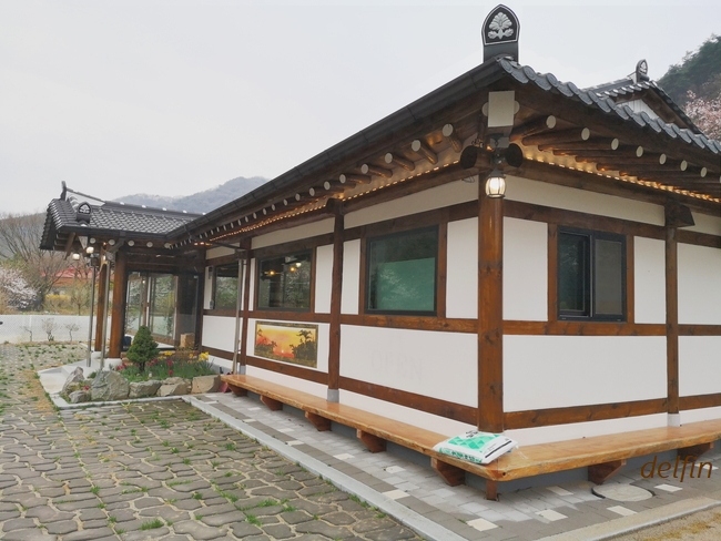 街道沿いのカフェ、大きな韓屋スタイルのレストランのような外観だが、店内はオシャレな装い。
