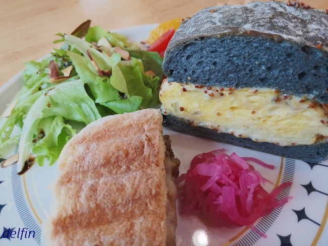 パニーニは自家製、黒いものはイカ墨入り、厚焼き玉子とのアレンジがシアワセな味。