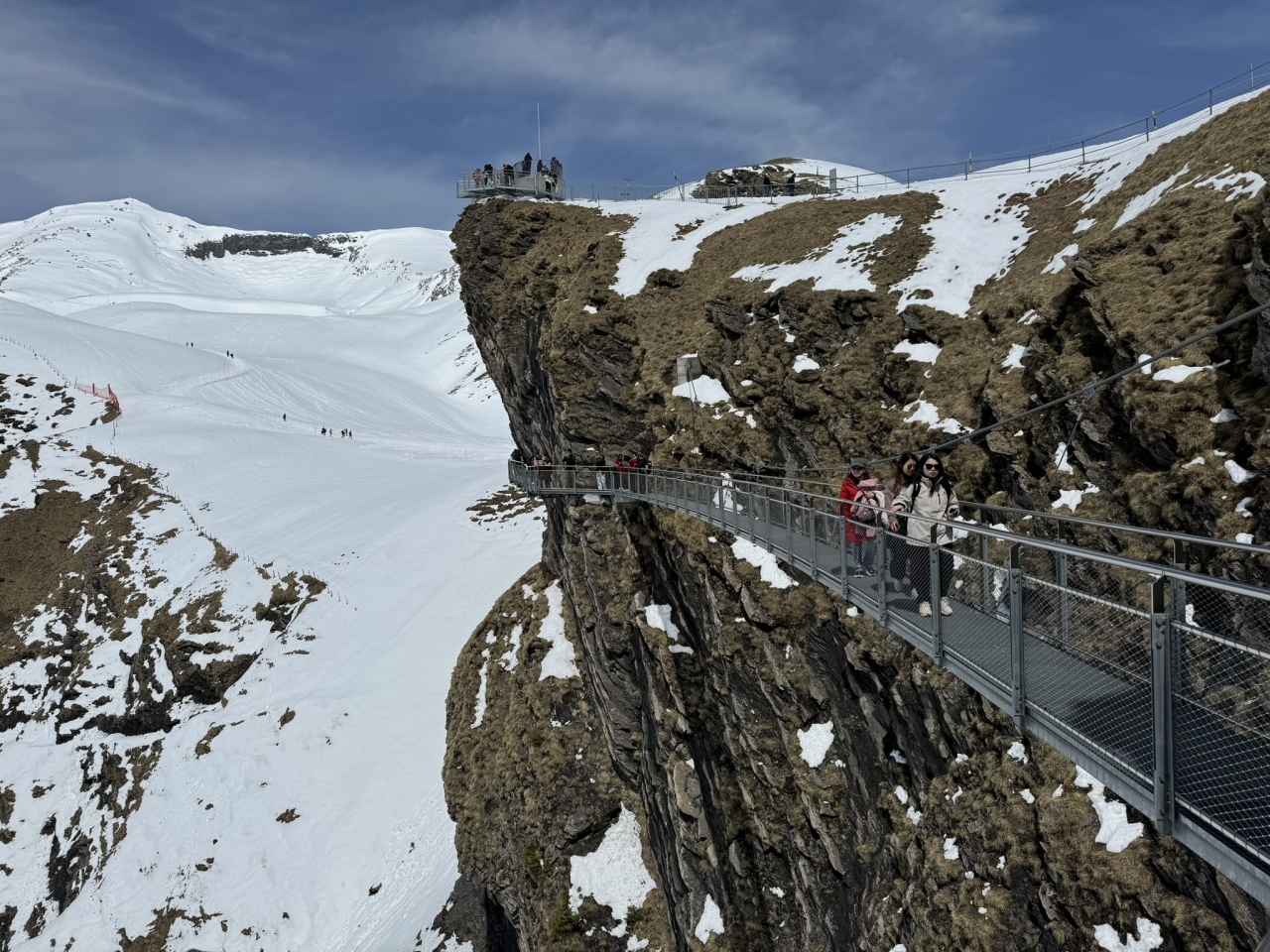 標高2167mのフィルストからは、アイガーから連なるスイスの山の景観がすばらしい、絶好の展望スポットです。ロープウェイの駅とつながっているレストランのテラス席は、端が展望スポットになっており、山の名前と標高が書かれた説明版と、実際の山の風景とを見比べて、山の名前を確認できるようになっています。
