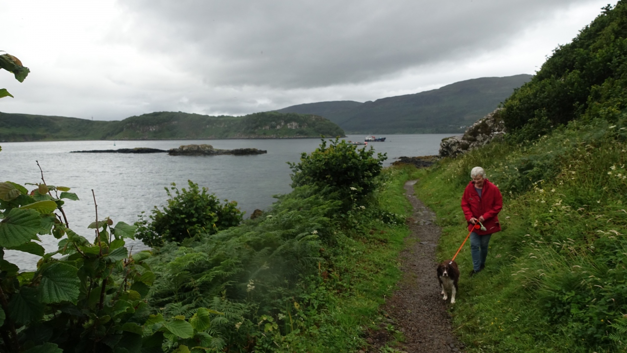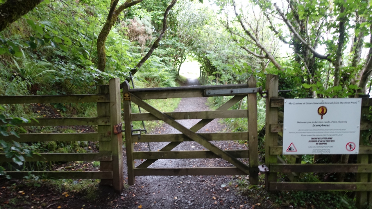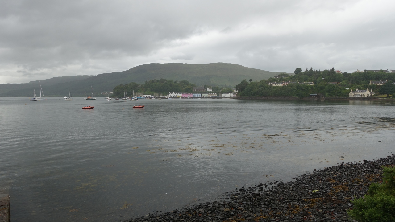 ポートリーでお手軽に歩くことが出来るトレイル。ポートリーから海を見下ろす高台の住宅地に沿った道を上がっていくと、港のカラフルな建物を遠望するビューポイントがある。高台から一旦海岸に出て、その先にフットパスのゲートがある。ゲートから緩やかな坂を行くと岬の展望台に出てボートの浮かぶポートリー湾を一望できる。その先は陸地が台形型になって海に沈むスカイ島らしい荒々しい光景が続く。