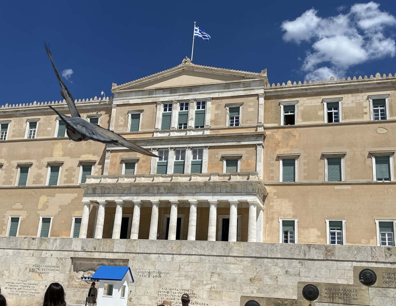 ツアーのフリータイムの時、一人で訪問しました。ドリア式の大理石の柱が印象深いです。もともとギリシア国王のオットーの王宮として建てられたもので、ドイツのバイエルン宮廷建築家カールトナーが設計、1842年に完成しました。その後1931年に改造され、国会議事堂となりました。観光で中に入ることはできませんが、毎正時に、ここの前、無名戦士の墓で行われる衛兵交代式は、見ることができます。観光客が大勢見ています。
