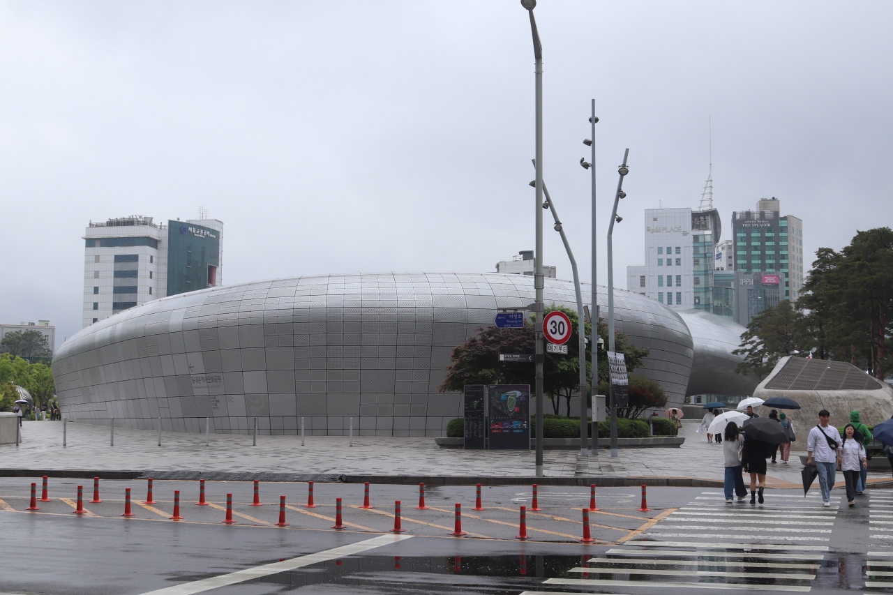 東大門駅を降りるとシンボルである東大門とこの巨大ドームのデザインプラザが目立ちます。巨大な円盤のようです。訪れた日は休みでしたが、ミュージアムやイベントスペースなどが入る巨大な空間のようです。東大門市場の先になります。