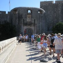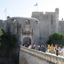 ネットで購入した【ドブロブニクカード】をツーリストインフォメーションで受け取った後、旧市街の散策をこちらの【ピレ門】から始めました。ドブロブニクを紹介するサイトで必ず紹介されている旧市街の西側にある石造りの立派な城門で、大勢の観光客が行きかっていました。門の手前は中世の城門らしい跳ね橋もあり旅情を掻き立てられました。