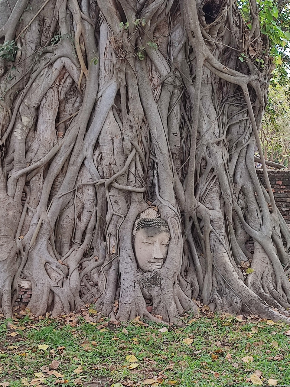 アユタヤ王朝初期の頃の遺跡であるワットマハタートにあり、アユタヤ観光の象徴のような場所でもあります。木の根元と一体化をした姿は確かにユニークではありますが、フォルムの優れたチェディのような素晴らしさはないです。