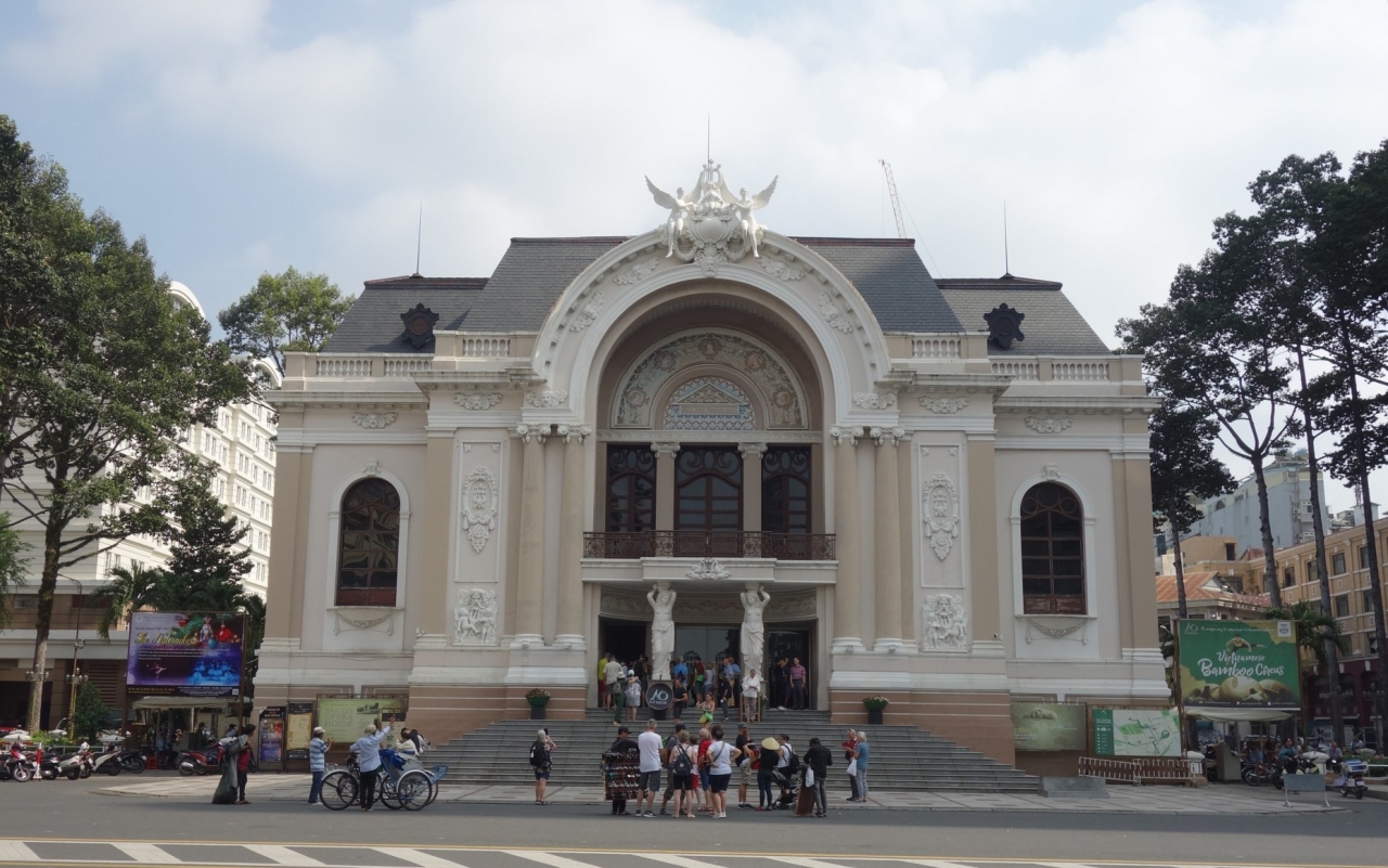 ホーチミンの大通りレロイ通りの前に広がるホーチミン市民劇場(ホーチミンオペラハウス)。あまり大きな建物ではありませんが通りに囲まれているので存在感があります。すぐそばのレックスホテルなどのレトロな建物と相まってヨーロッパモダンな雰囲気が味わえます。