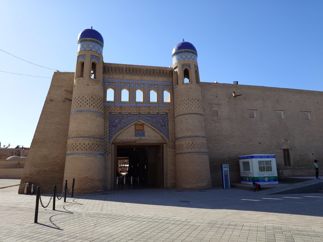 イスラムホジャメドレセやミナレットなどが近い、観光客で賑わう東門です。外から見ると青い装飾のある二本の塔に挟まれていて、異世界の城壁の門ぽくてかっこいいです。門の中にはお土産屋が入ってますが、門の外はだだっ広い広場です。