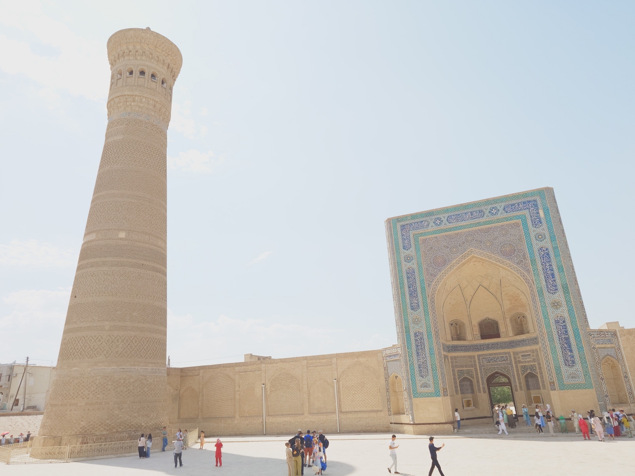 カラーンメドレセの前に立っている、ブハラのシンボル的なミナレットです。色はありませんが細かい装飾やジオメトリックな模様が素敵でした。中には入れませんでした。夜は広場一体がライトアップされていて綺麗です。