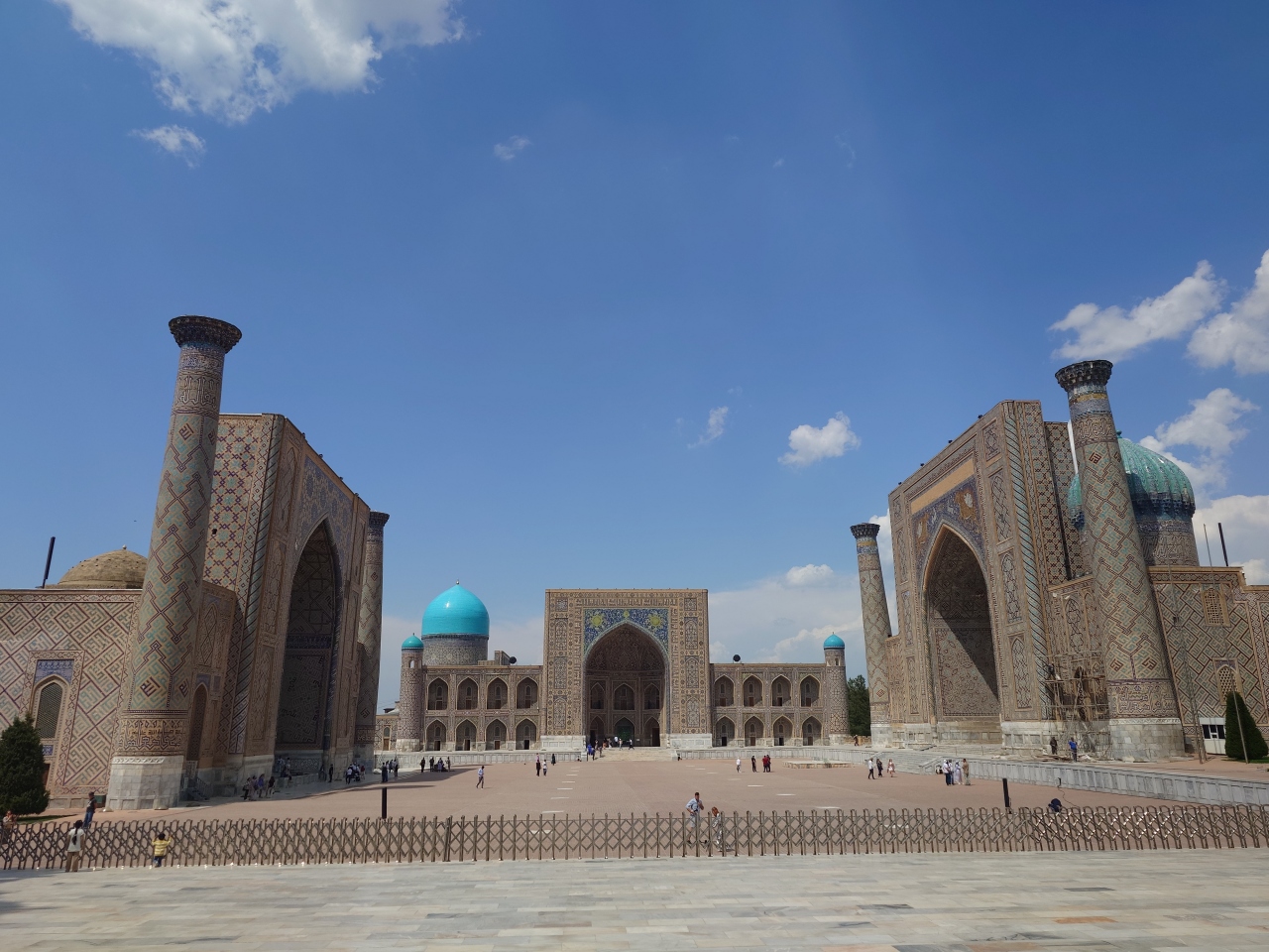 ウズベキスタンと言えばサマルカンド、サマルカンドと言えばレギスタン広場。というくらい有名な観光地です。3つのメドレセがそれぞれ気合の入った作りで、外観が素晴らしいだけでなく、内部も凄いです。広場に入るのにチケットが必要ですが、是非入って装飾などを近くで見ると良いと思います。夕方から夜のライトアップが素敵でした。