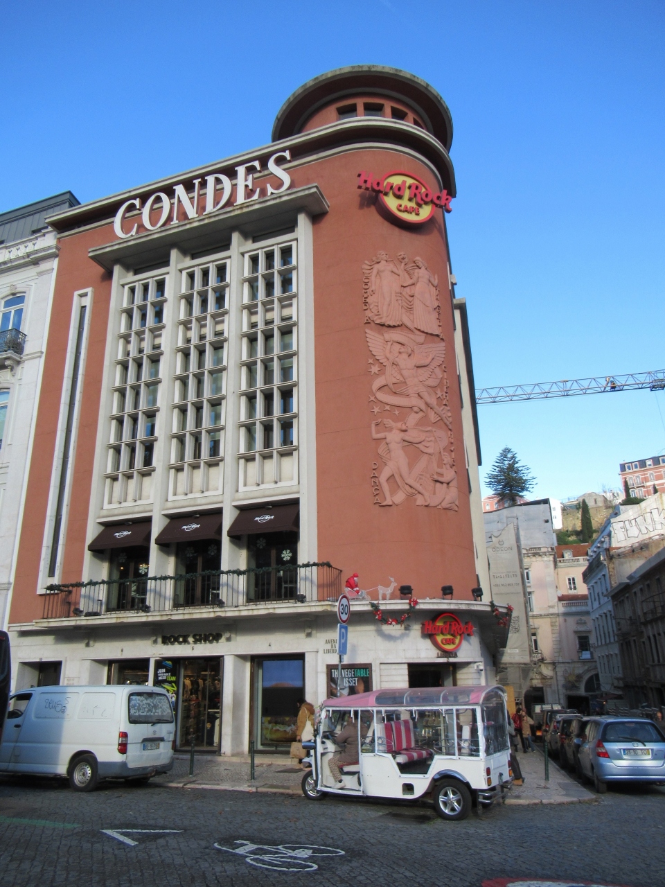 ハードロックカフェ・リスボンが入っている茶色の建物の上部には「CONDES」と書かれた大きなサインがあって、元は映画館だったものが2003年にリスボンのハードロックカフェに改装されたそうです。