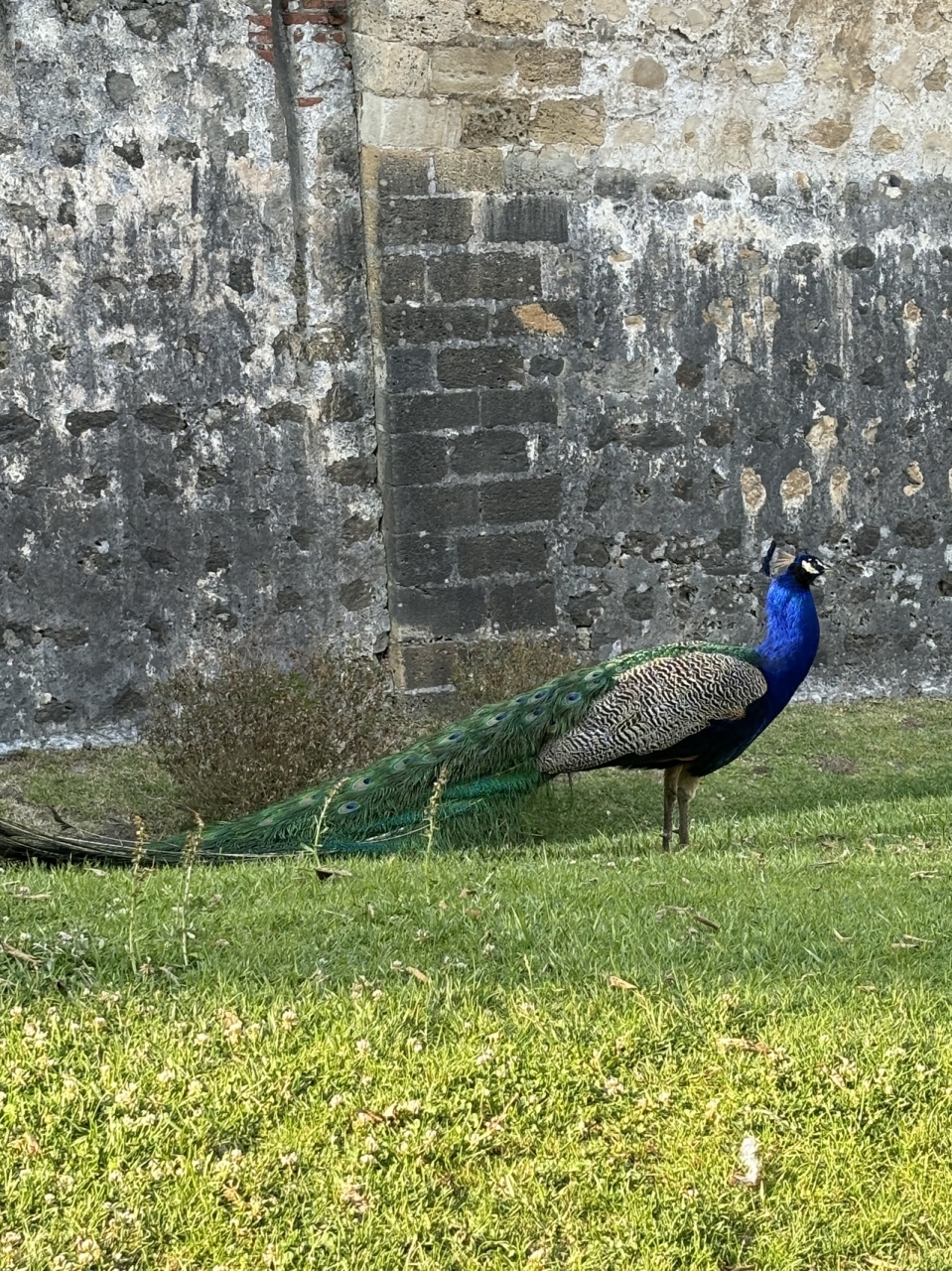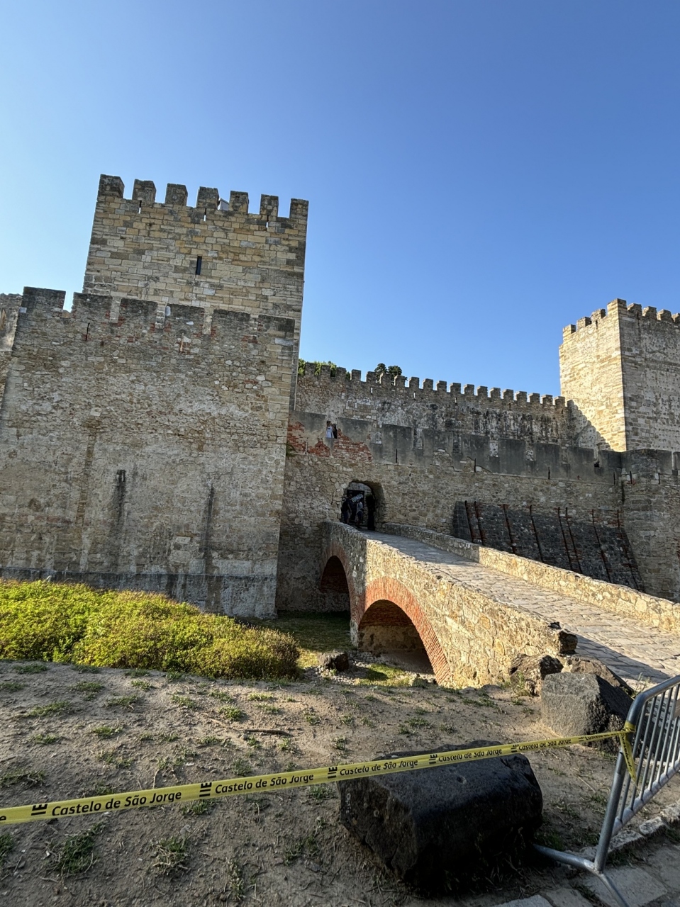 お城かな?と思ったら、メインは庭の展望台だった!ここはリスボンカード専用の入口がありましたが、どちらも並んでいませんでした。カードを見せてチケットをもらいます(リスボンカードで無料)。中に入ると、街が見渡せる展望台になっていました。ここからの景色は美しかったです。さてお城は、というと ほんの一部のみが残された状態でした。お城の上に上ったり、城壁巡りが楽しめます。孔雀がたくさんいて、皆喜んで写真を撮っていました。城跡の展望台公園という感じ。お庭からの眺めがとてもステキでした。ものすごい坂を上りますが、リスボンカードならバスにも乗れるのでいいかと思います。