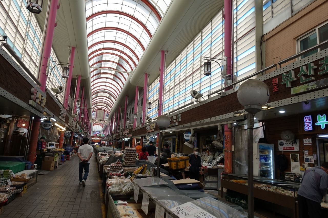 釜山駅前の草梁洞は、韓国第2の都市の玄関口にも関わらず、表通りから1歩裏に入るだけで、庶民的な街が広がります。草梁市場も、観光客向けではない地元民向けの「アーケード商店街」。手っ取り早く、韓国の普通の街の雰囲気に浸れます。