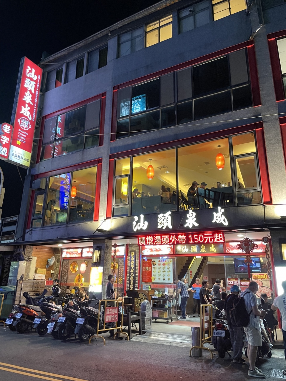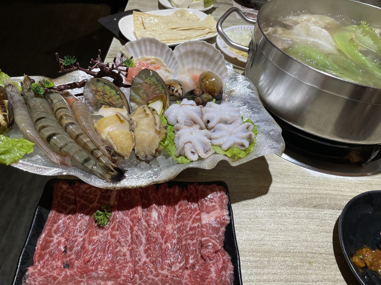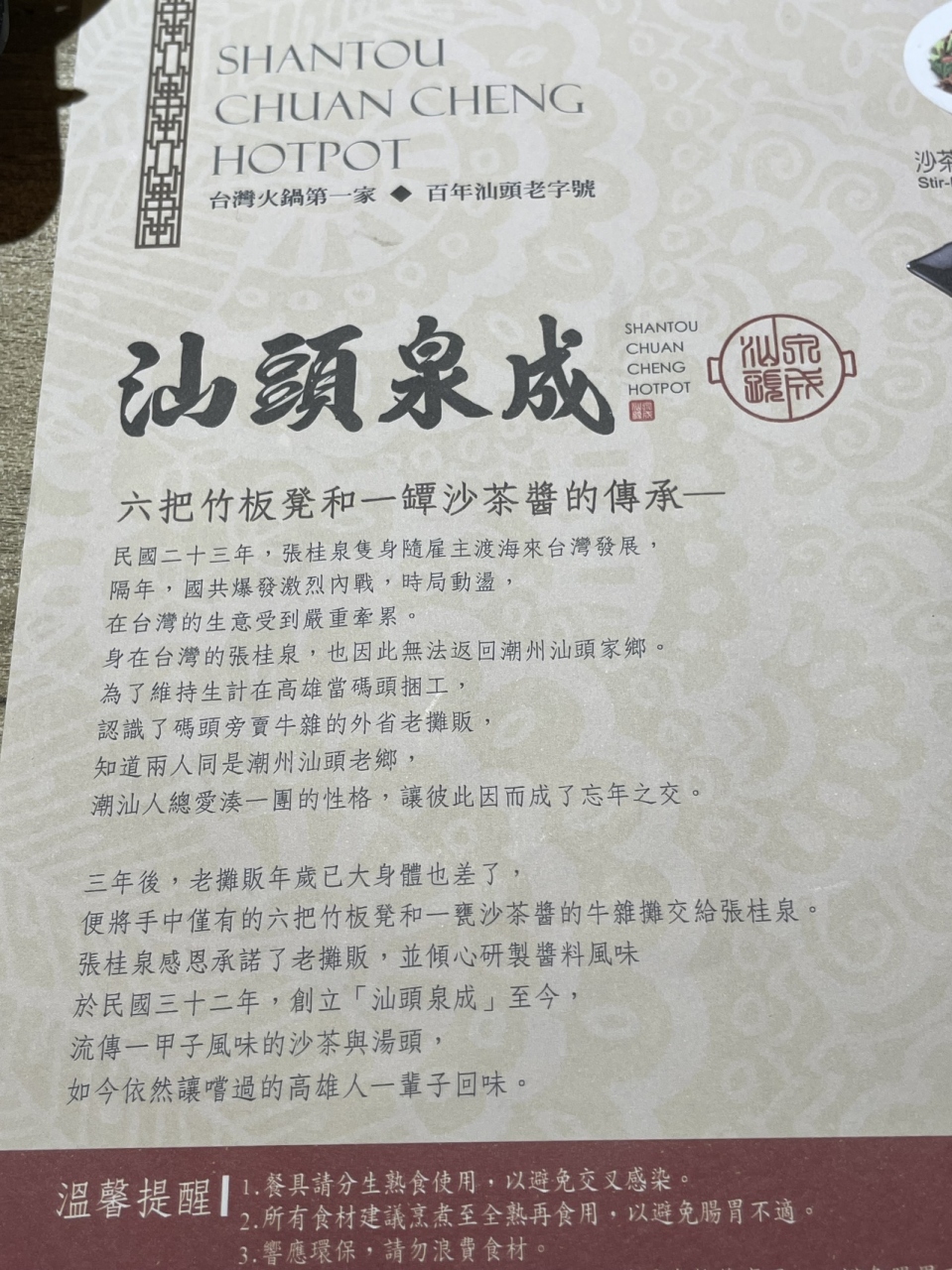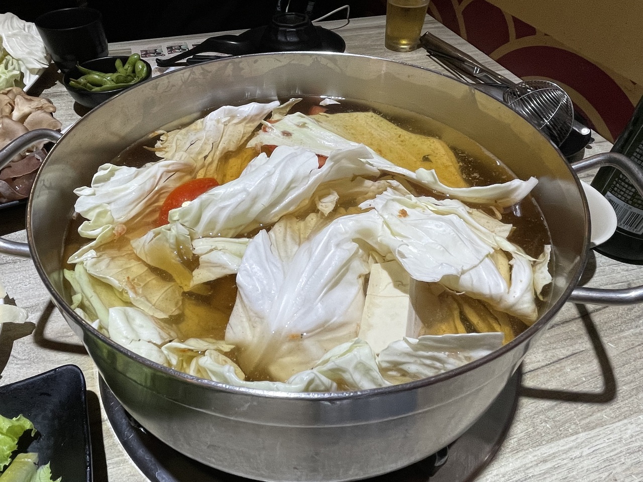 汕頭鍋、少しの塩気を感じる魚の出汁に入れたお肉海鮮野菜類をピーナッツベースにナンプラーを加えたような沙茶醤につけていただきます。沙茶醤の味に馴染めず醤油ベースで食べましたが、さっぱりとした鍋で湯葉やきのこ類がとてもおいしかったです。土曜日の夕方は家族連れで賑わう繁盛店でした。
