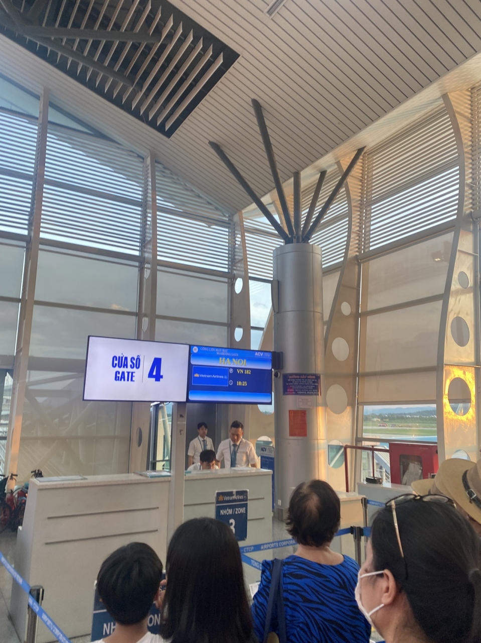 市内からも近くて便利な立地です。空港自体もきれいでした。帰りはハノイ経由だったので搭乗はベトナム航空の国内線。空港には早めに到着でしたが、チェックインは早々に出来ました。今回はビジネスクラスだったのでスムーズなチェックインでしたが、エコノミーのカウンターはけっこう混雑していました。保管検査場先の制限エリア内には軽食のお店もあり、時間潰しも容易です。