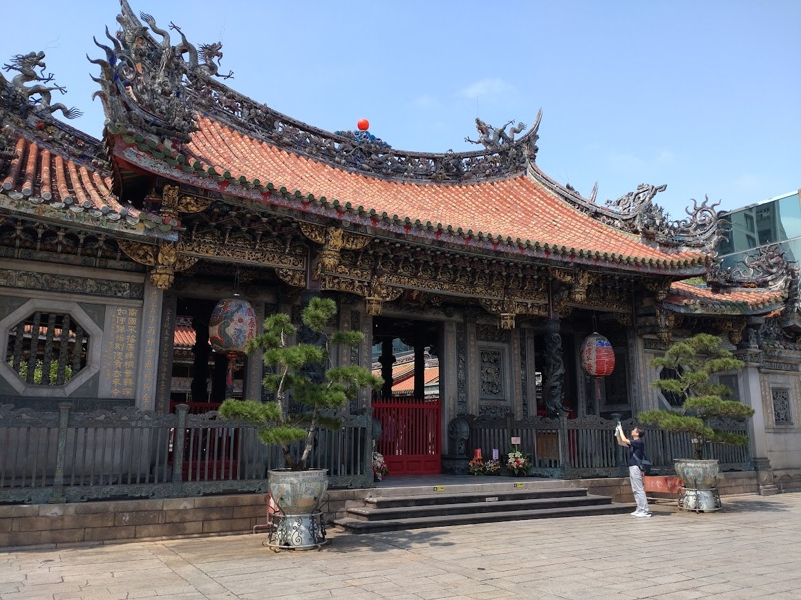 龍山寺の門をくぐると右側に滝がありますが、正面に見えてくるのが前殿です。ここで先にお詣りするのかと思いきや、ほとんど誰もおらず、みんな右側に回り込んでいます。右側の入口から入って振り返るようにして参拝するのがしきたりだそうです。