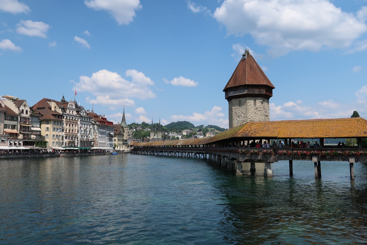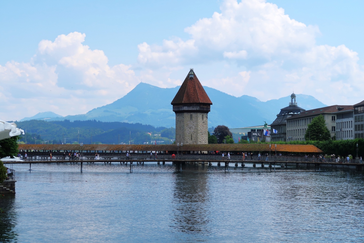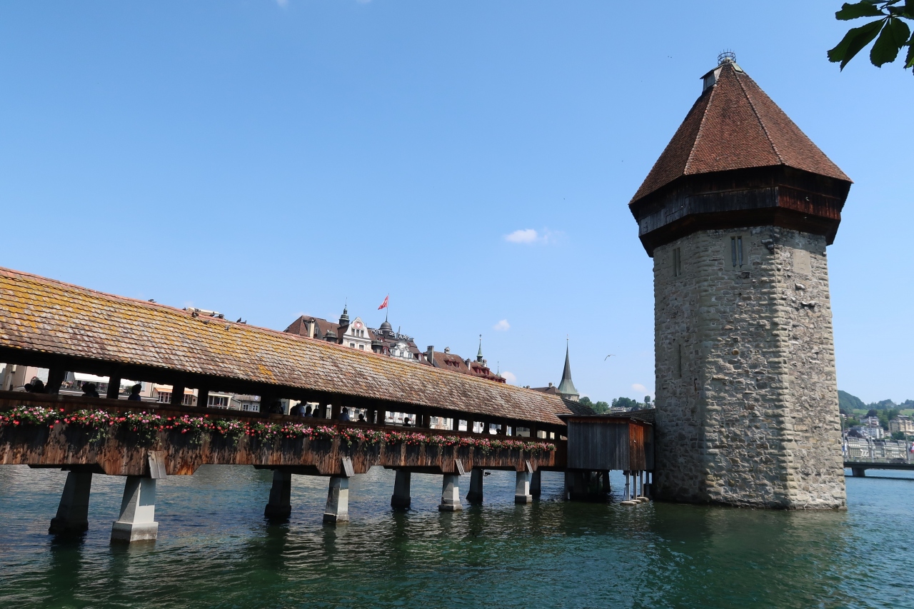 カペル橋のそばのホテルに宿泊したので、旧市街へ向かう際に早速カペル橋を利用しました。屋根の梁に飾られている板絵を鑑賞しながら10分かけて渡っていきました。橋の上から見える旧市街の景色も楽しめました。八角形の瓦屋根が印象的な水の塔は町のシンボルのようで、ルツェルンを代表する老舗チョコレート店の商品のデザインにも採用されていました。とろけるおいしさのWasserturm noirというプチプライスのチョコレートがおすすめです。ぜひお試しください。