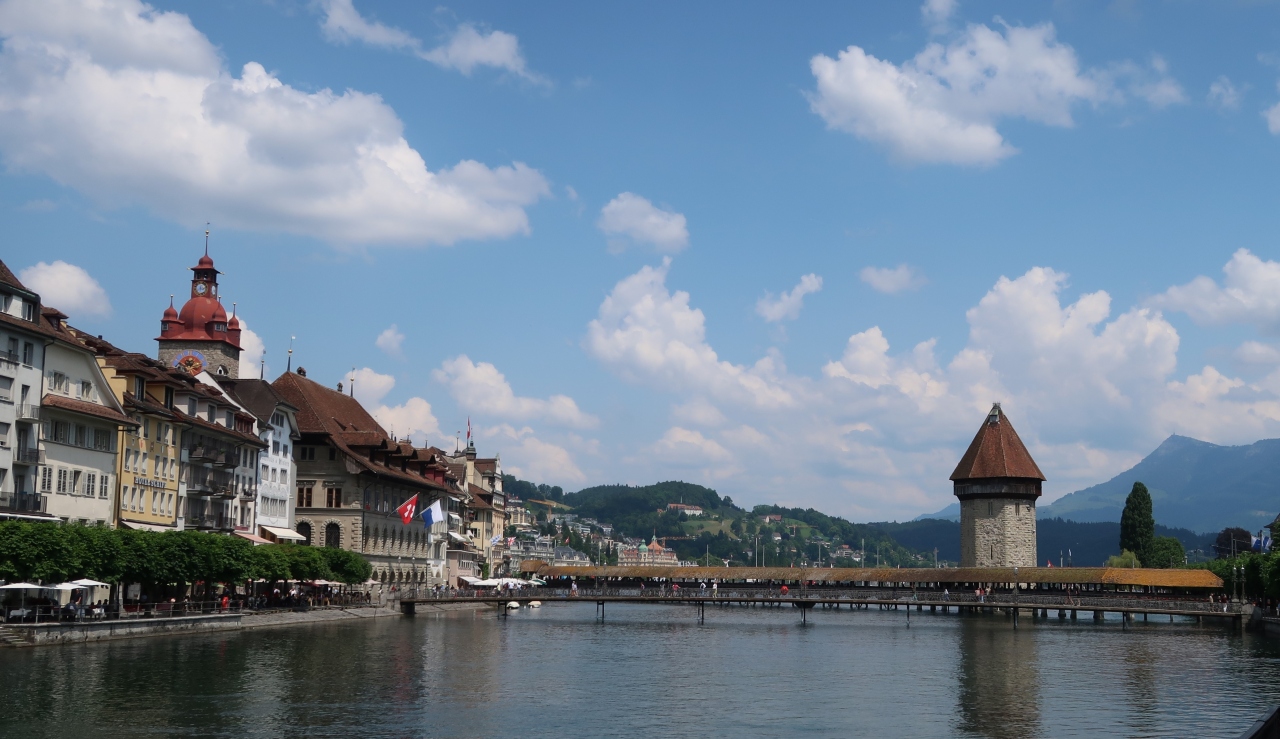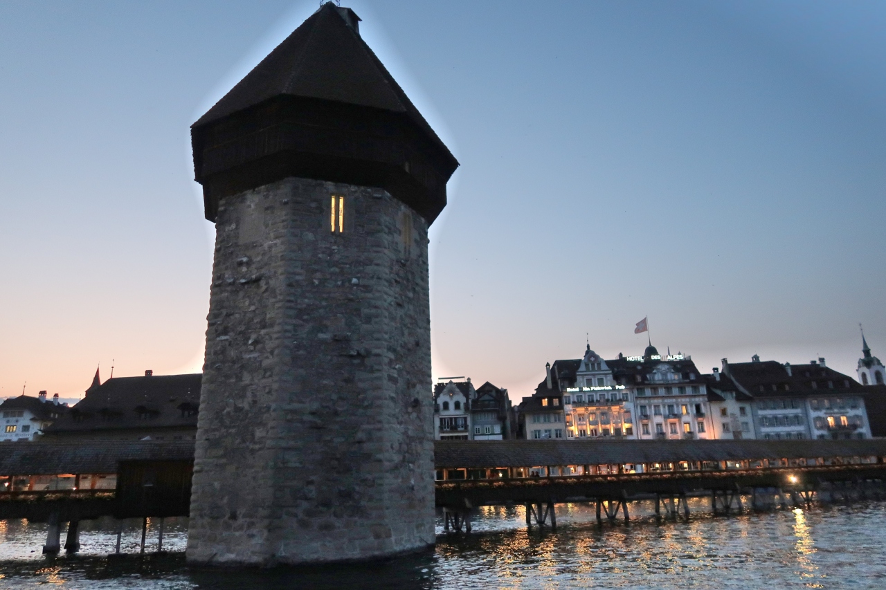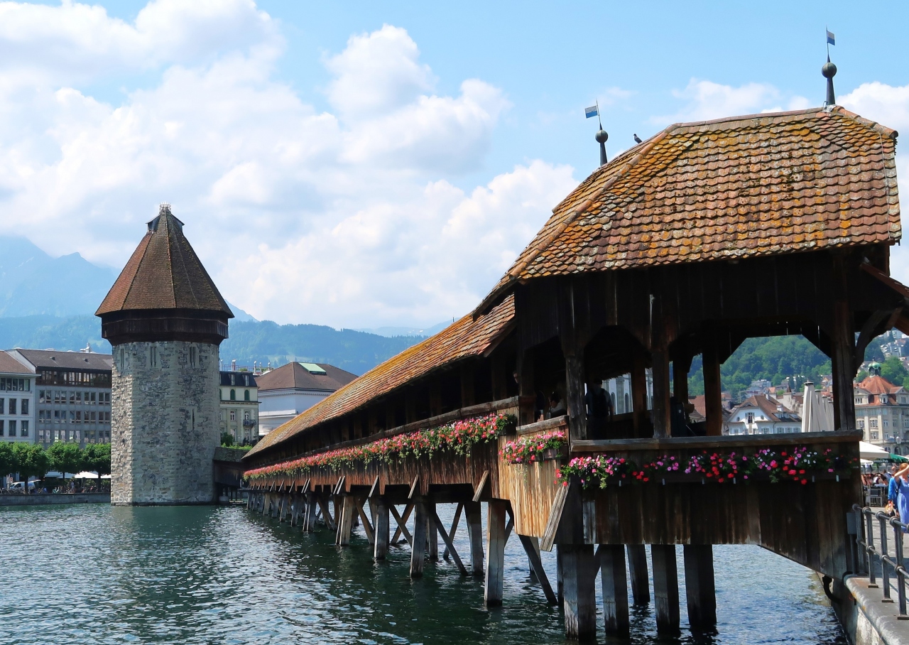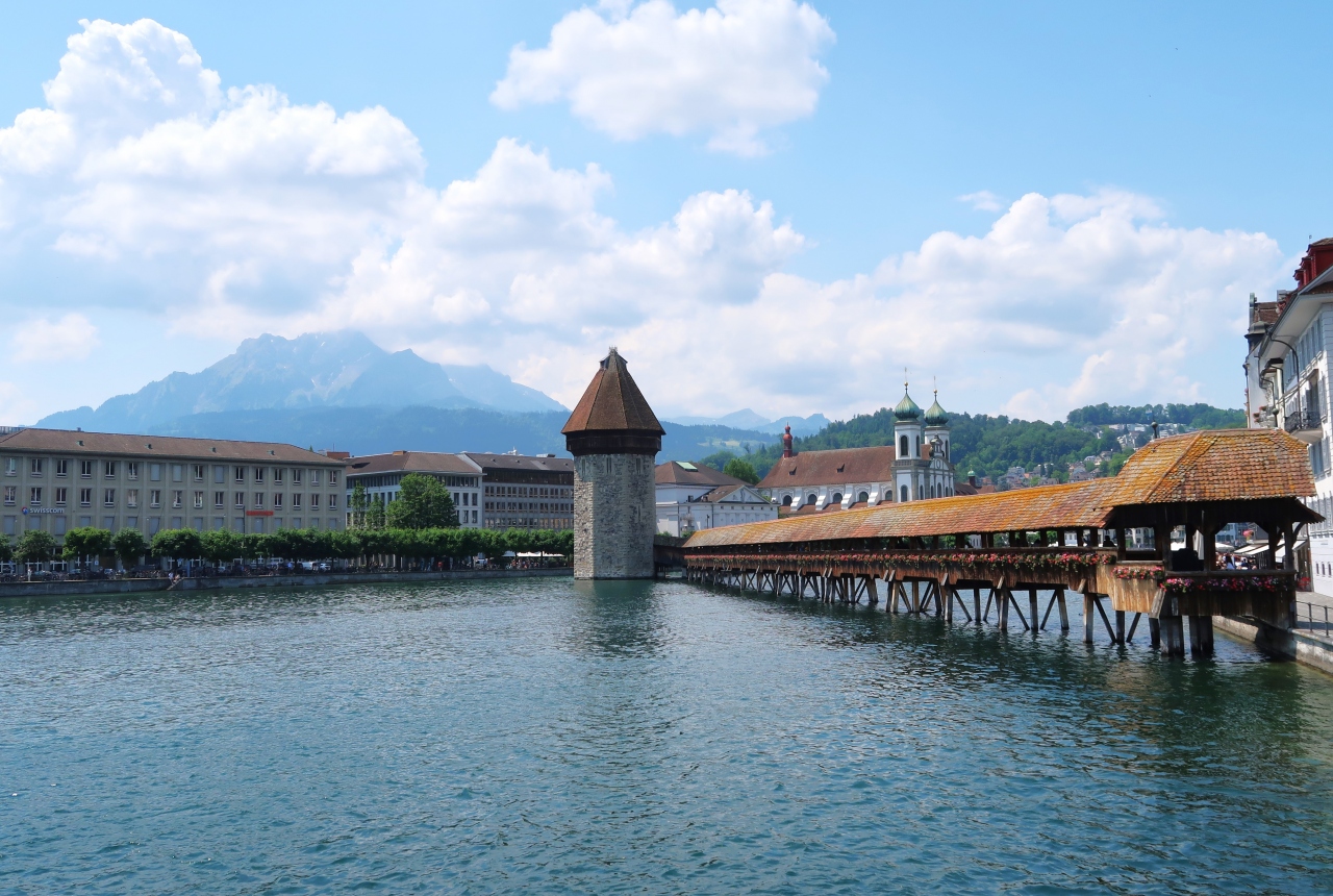 カペル橋のそばのホテルに宿泊したので、旧市街へ向かう際に早速カペル橋を利用しました。屋根の梁に飾られている板絵を鑑賞しながら10分かけて渡っていきました。橋の上から見える旧市街の景色も楽しめました。八角形の瓦屋根が印象的な水の塔は町のシンボルのようで、ルツェルンを代表する老舗チョコレート店の商品のデザインにも採用されていました。とろけるおいしさのWasserturm noirというプチプライスのチョコレートがおすすめです。ぜひお試しください。