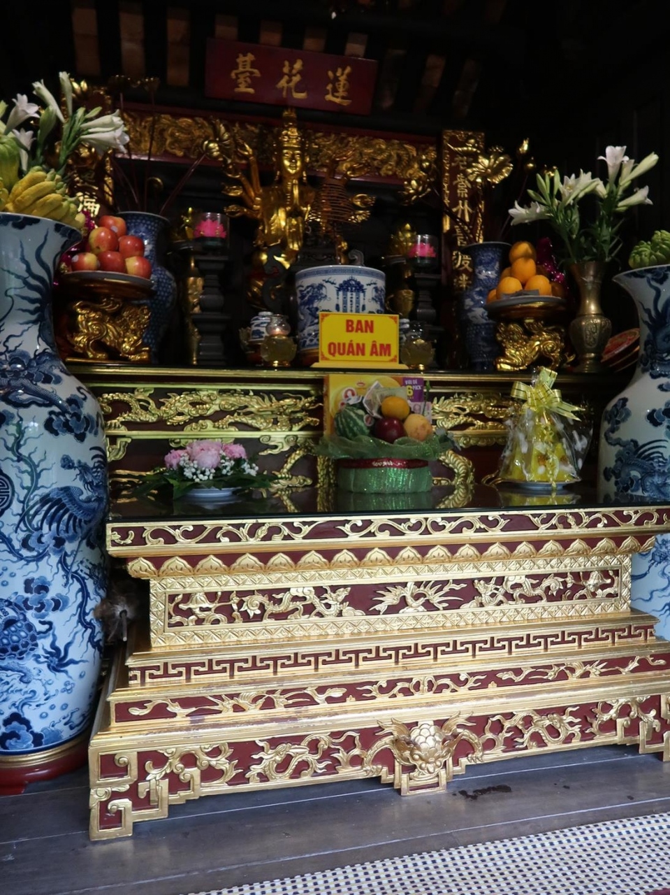 内部には蓮花台と呼ばれる祭壇があり、八本の腕を持つ金色の観音様が祀られています。