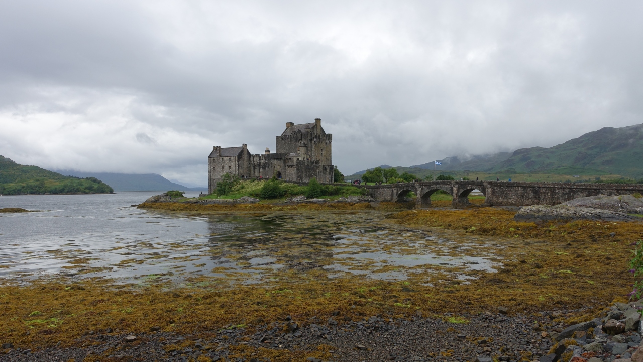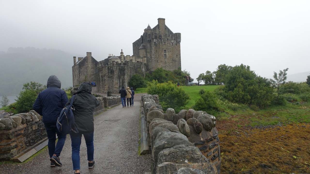 アイリーン ドナン城はスカイ島の入口の町カイル・オブ・ロハルシュ近くにある古城。陸地に深く入り込んだ入江の浅瀬の小島に建っていて、あたかも海に浮かんでいるように見える。城は800年前に建設されたが、18世紀のジャコバイト反乱に与したため政府軍に破壊され、現在の形に修復されたのは20世紀になってから。天守閣にあたる居館内は撮影禁止だが大して印象に残る展示品はなかった。この城はスコットランドで最も美しい城と言われる通り、外観を周囲の自然風景と合わせて眺めるのがいい。