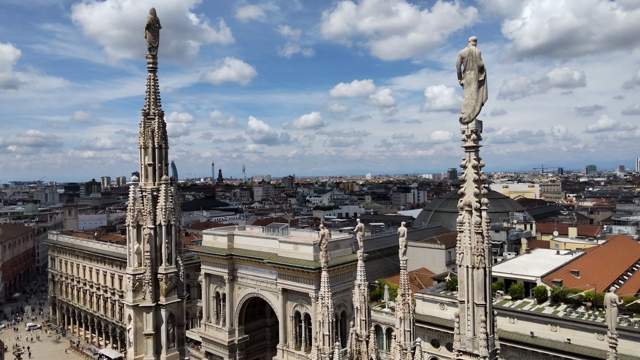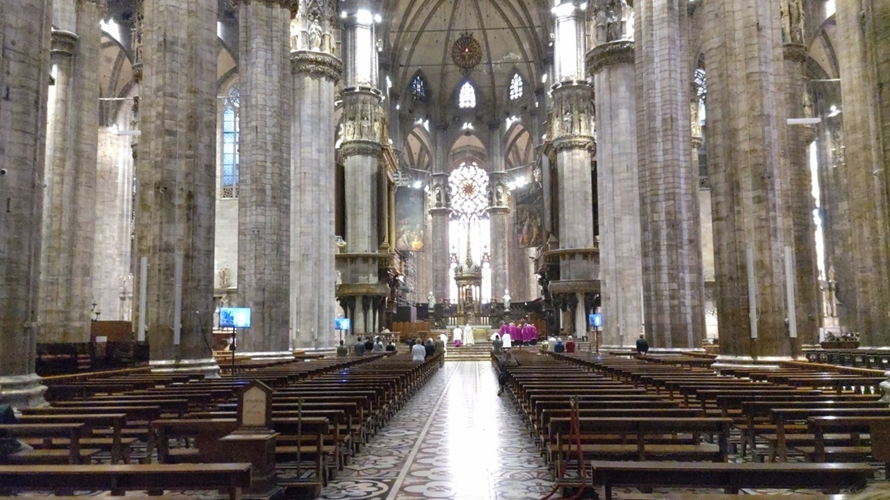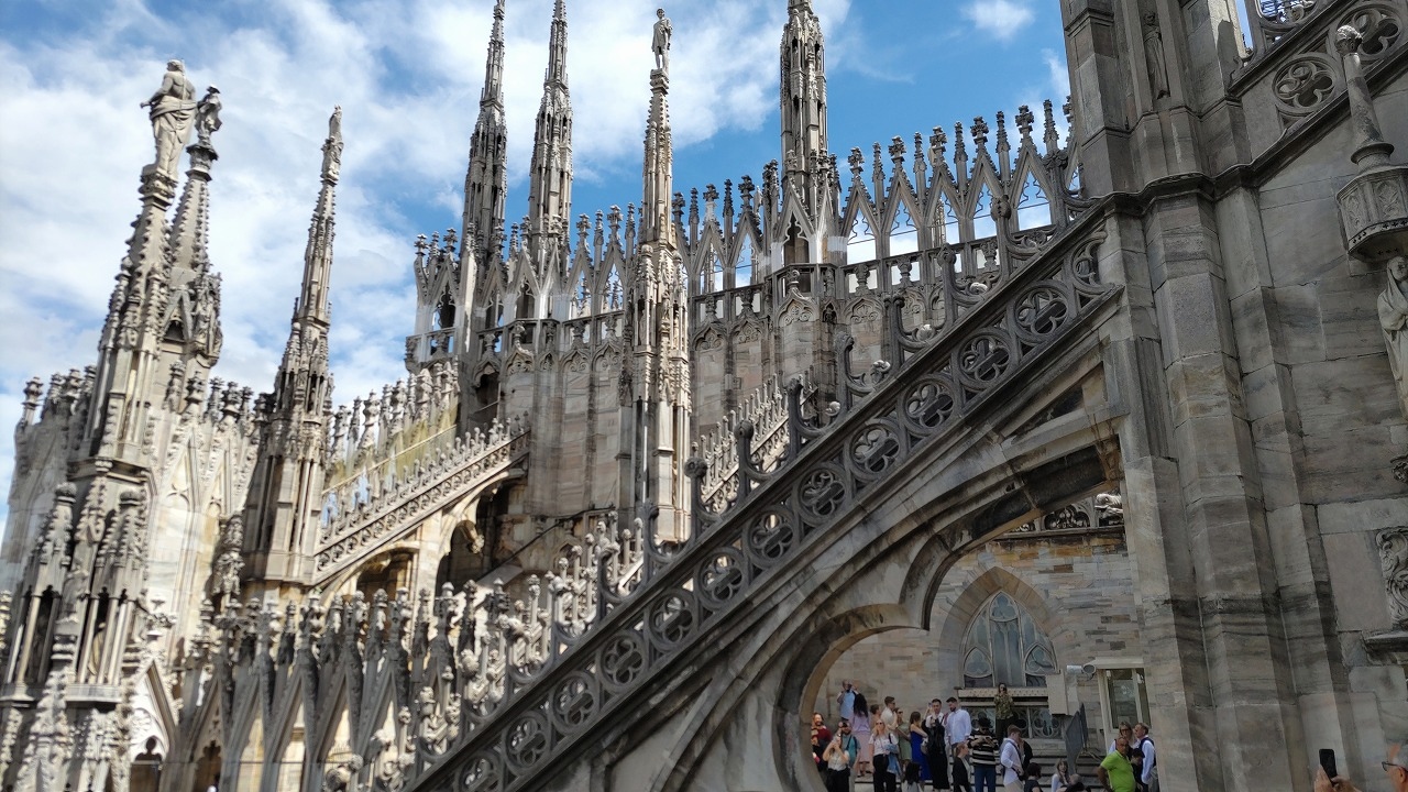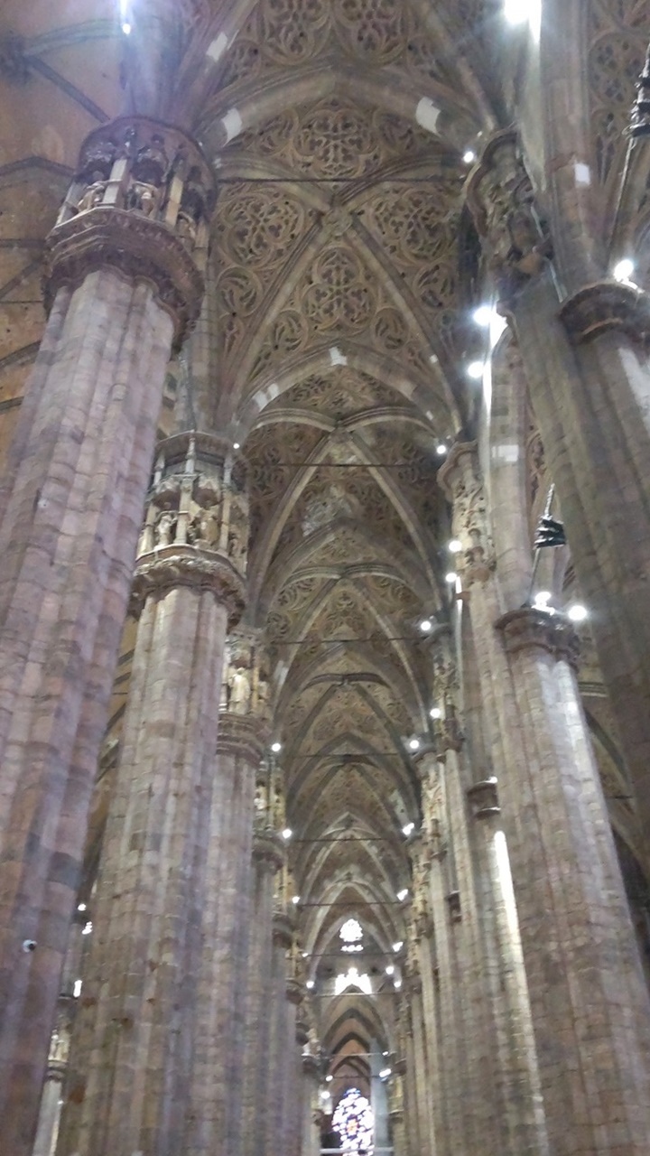 昼ぐらいにオフィスチケットに並んでチケットを買おうとしたら、当日券は売り切れていました。幸い、私達はミラノでは日程に余裕があったので、後日見学できましたが、事前にチケットを買っておいた方が良いと思います。チケットオフィスは長蛇の列が出来ていましたが、オンラインでも買えます。屋上テラスに上るのが目的でしたが、外観や聖堂内も素晴らしくて圧巻でした。たまたま日曜日だったので、ミサをやっていました。美しいステンドグラスのある厳かな聖堂内にパイプオルガンや歌声が響いて素敵でした。屋上テラスはエレベーター利用のチケットを購入しましたが、帰りは階段でした。エレベーターを降りてからも結構階段がありましたし、屋上テラスは歩きづらいので、荷物は少なく、歩きやすい靴で行くのが良いと思います。