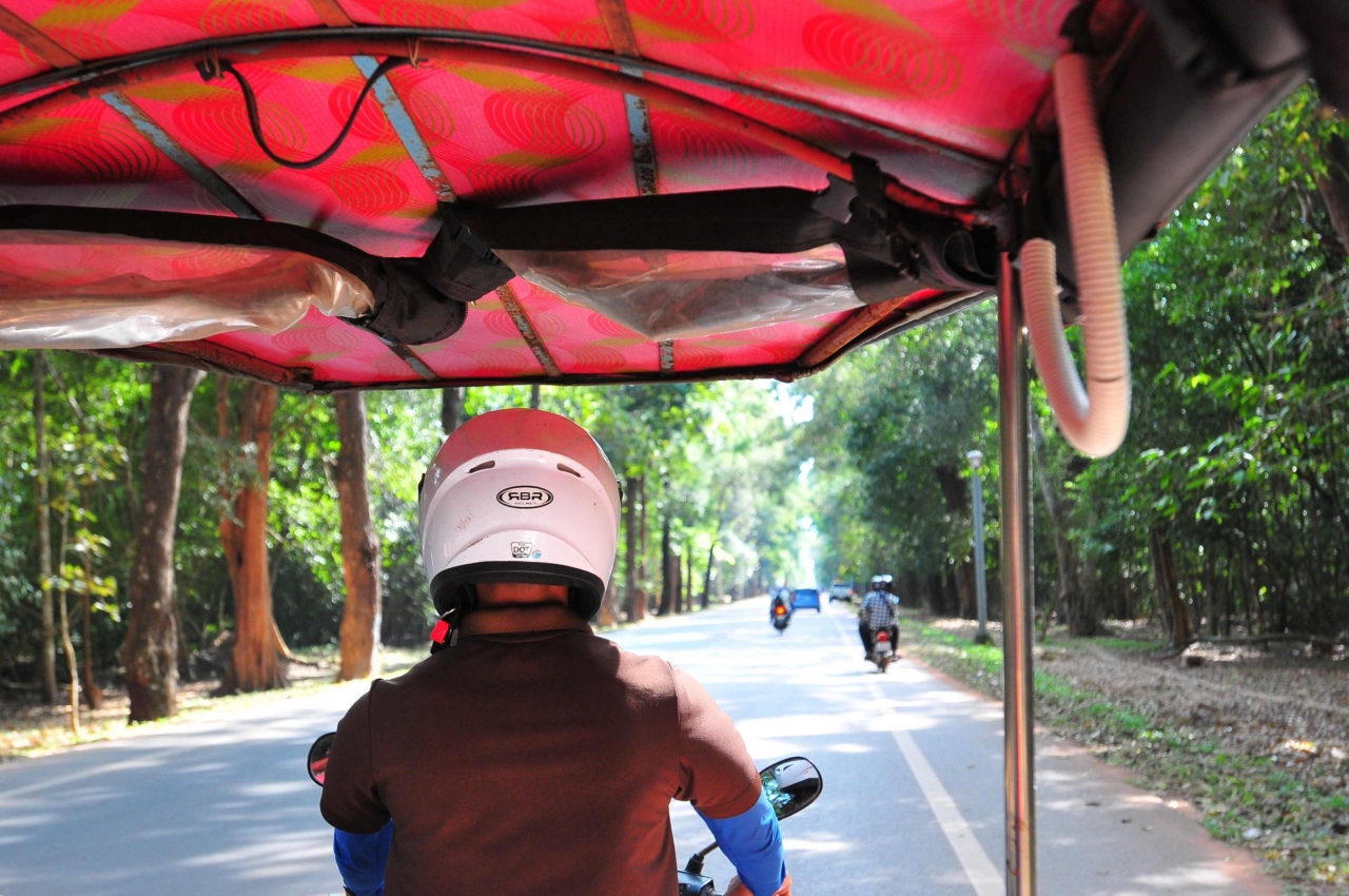 アンコールの遺跡巡りに欠かせないのがトゥクトゥクです。アンコール小回りコースやアンコール大回りコースだけではなく、かなり遠くのクバールスピアンやバンテアイスレイもトゥクトゥクで訪問しました。ただし、風と土埃対策にサングラスとウィンドブレーカーは必須です。