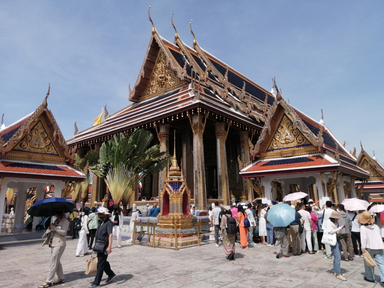 ワットプラケオの中央に沈砂する本堂。ご本尊自身も美しいが、建物自体の装飾も半端なく美しい。人出が非常に多いが観光客だけでなくしっかりお参りする人も多く、信仰の場であることが再認識される。靴を脱いでお参りする。
