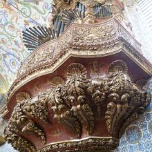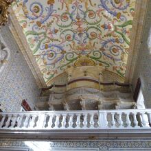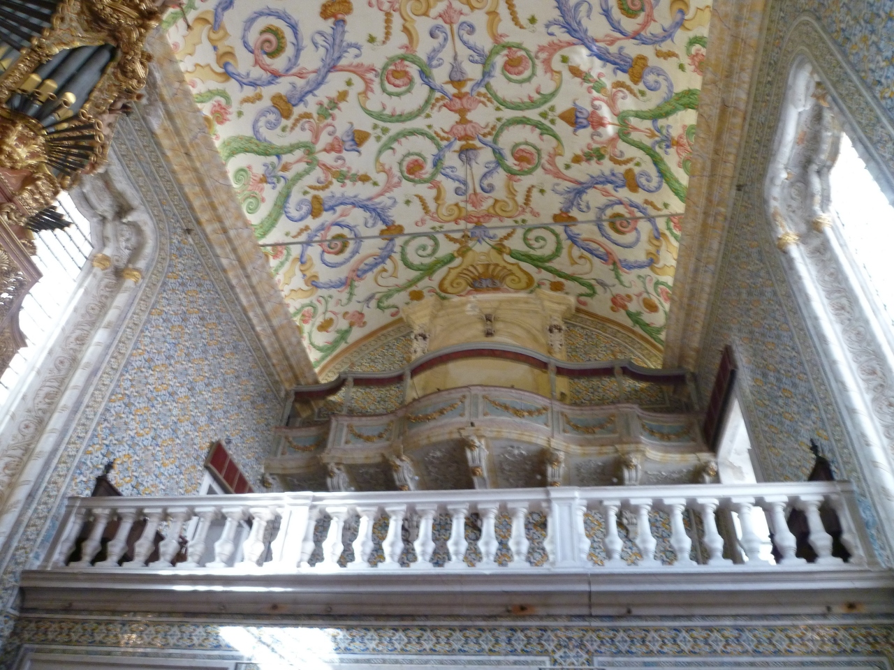 主祭壇;階段の上に`大きな黄金輪`(翼の聖ミカエルの剣/秤は,,)、祭壇;聖母マリア様、柱のアズレージョも見事です! 天井のフレスコ画/壁のアズレージョとは異なり`豪華なオルガン…∇方式;パイプが礼拝堂全体に鳴り響く事が分かりますね☆ 王様が祈る場所は違う一般者とは別に、二階の後列に…王朝時代ですね!