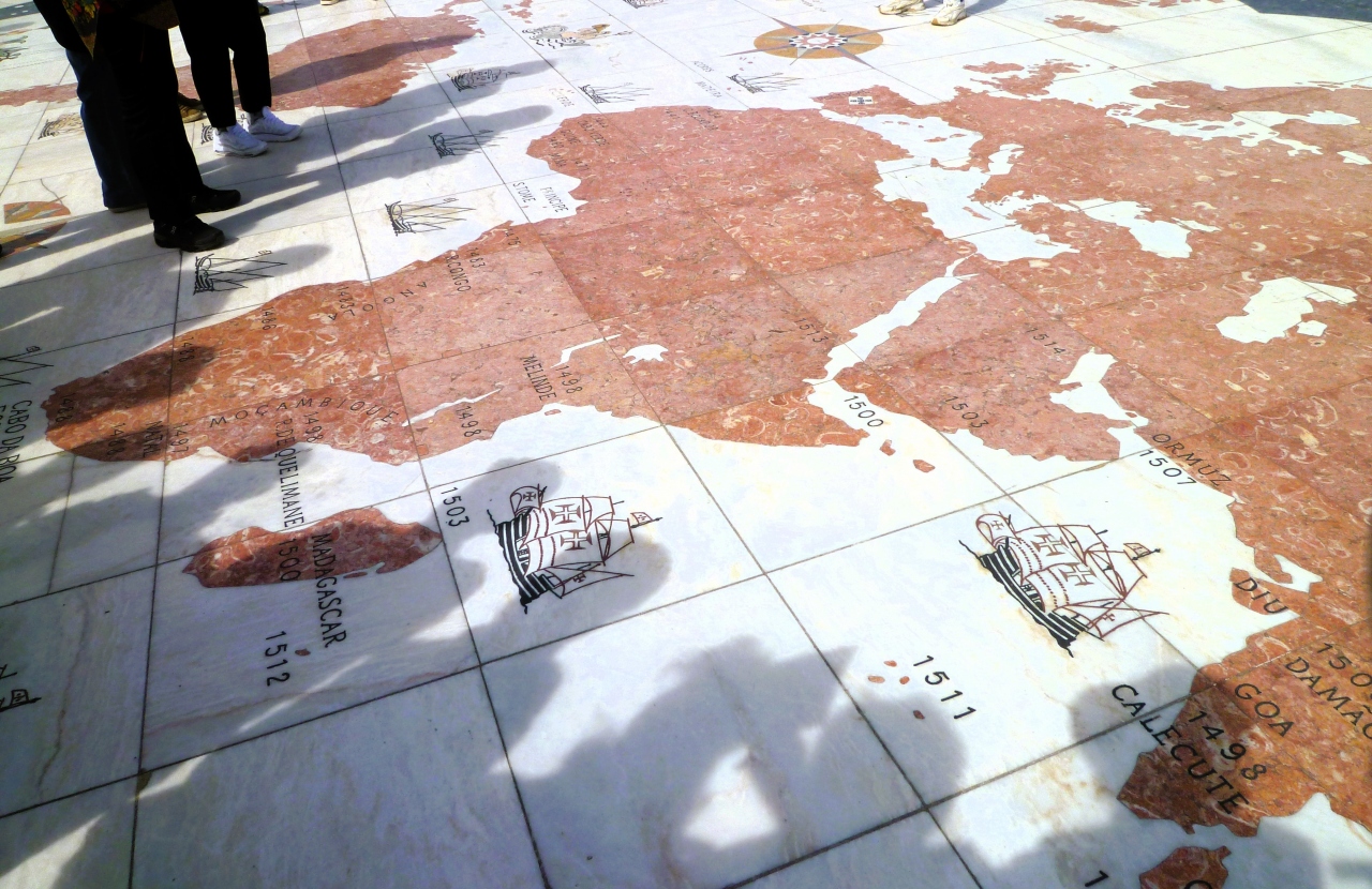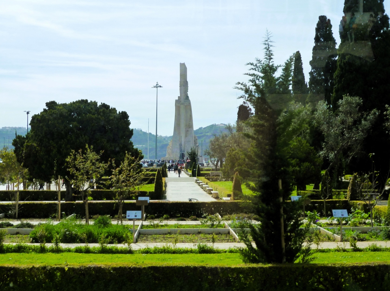 観光バスで街路樹なかに`発見のモニュメント;ガイドさんは`ベレンの塔→発見のモニュメント→(翌朝)ジェロニモス修道院`を♪`を見ましたのが<ベレン地区>に来たのですね;水上飛行機 サンタ クルス号`/世界地図のモザイクも観ましたょ☆