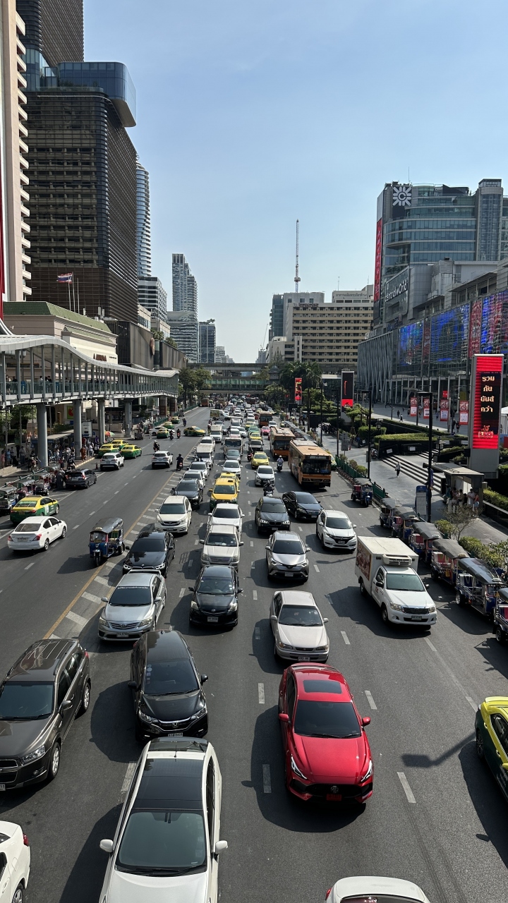 バンコク有数のお祈りスポットであるエラワン・プームからはじまり、伊勢丹があったセントラルワールドプラザや大丸の跡地であるビックCなどをはじめいろいろなホテルラチャダムリ通り。観光客も多いのですが、各種施設も多いだけあって車通りは常に多いです。