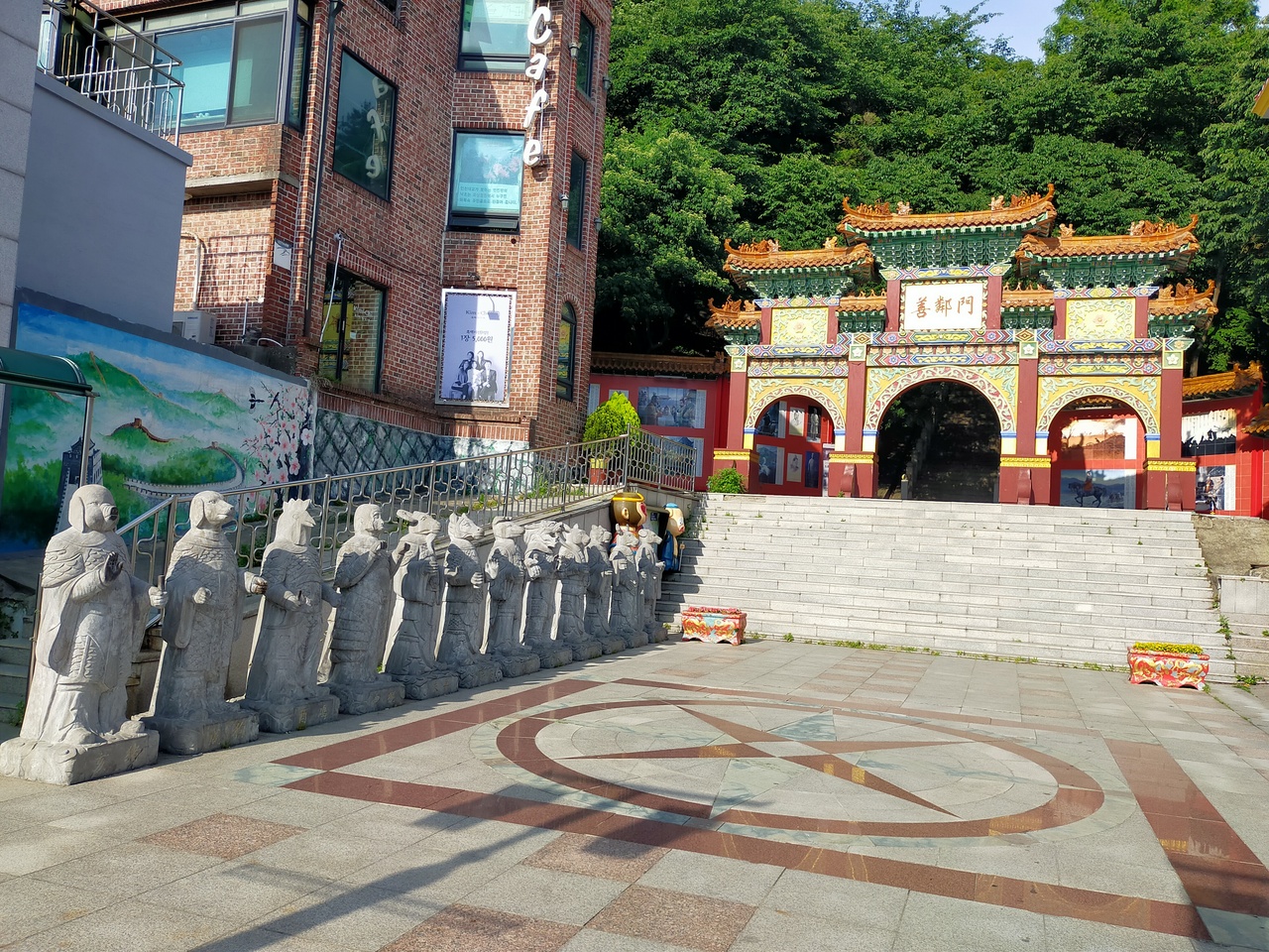 仁川のチャイナタウンには、3つの門があり、奥の自由公園の入口にあるのが、善隣門です。駅の観光案内所で3箇所の門を見るように案内されました。派手な階段を登りきったところにあり、手前には石像もならんでいました。